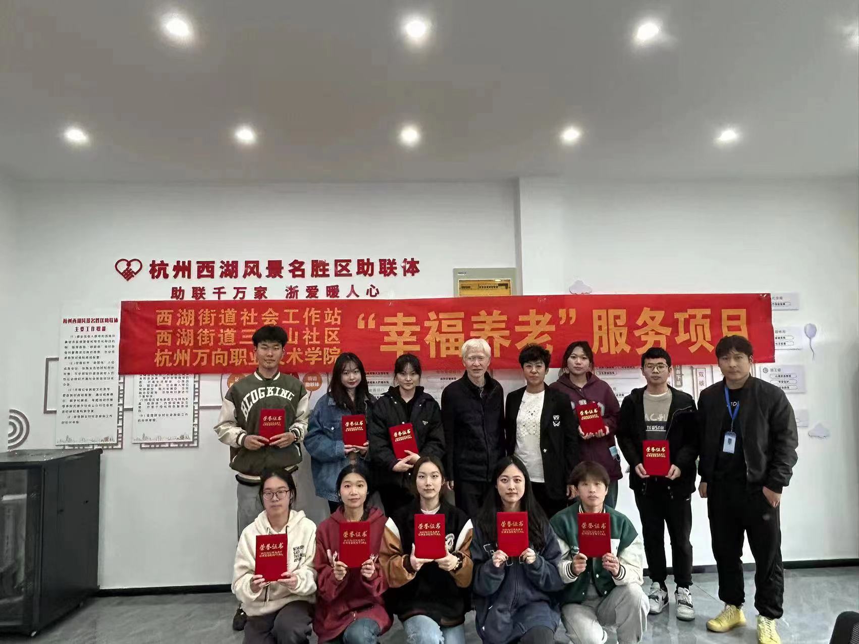 近日,西湖街道社会工作站为学院参与“幸福养老”服务项目的康养旅游系护理专业10名学生志愿者颁发了荣誉证书,用以感谢和表彰他们为社区“幸福养老”服务作出的积极努力和贡献。