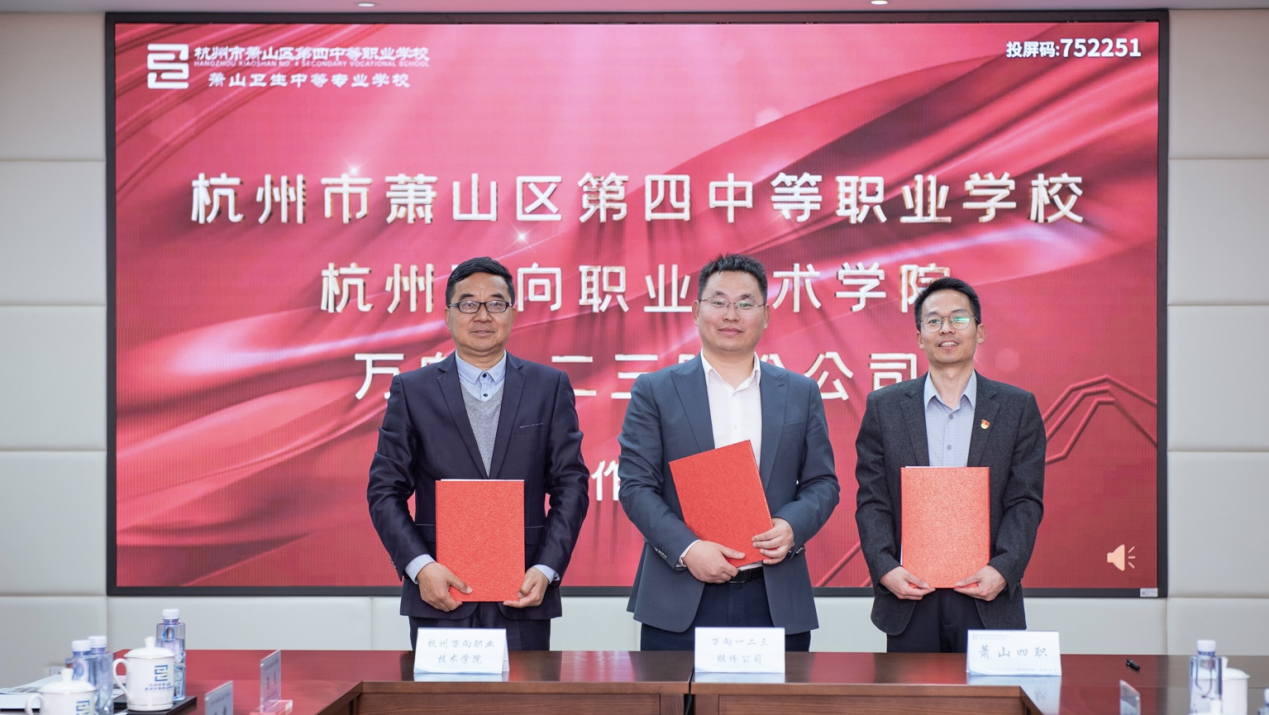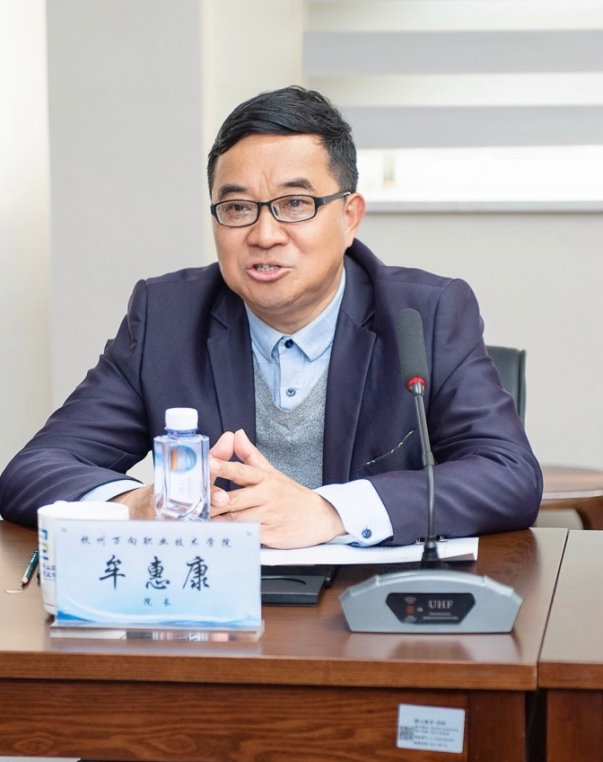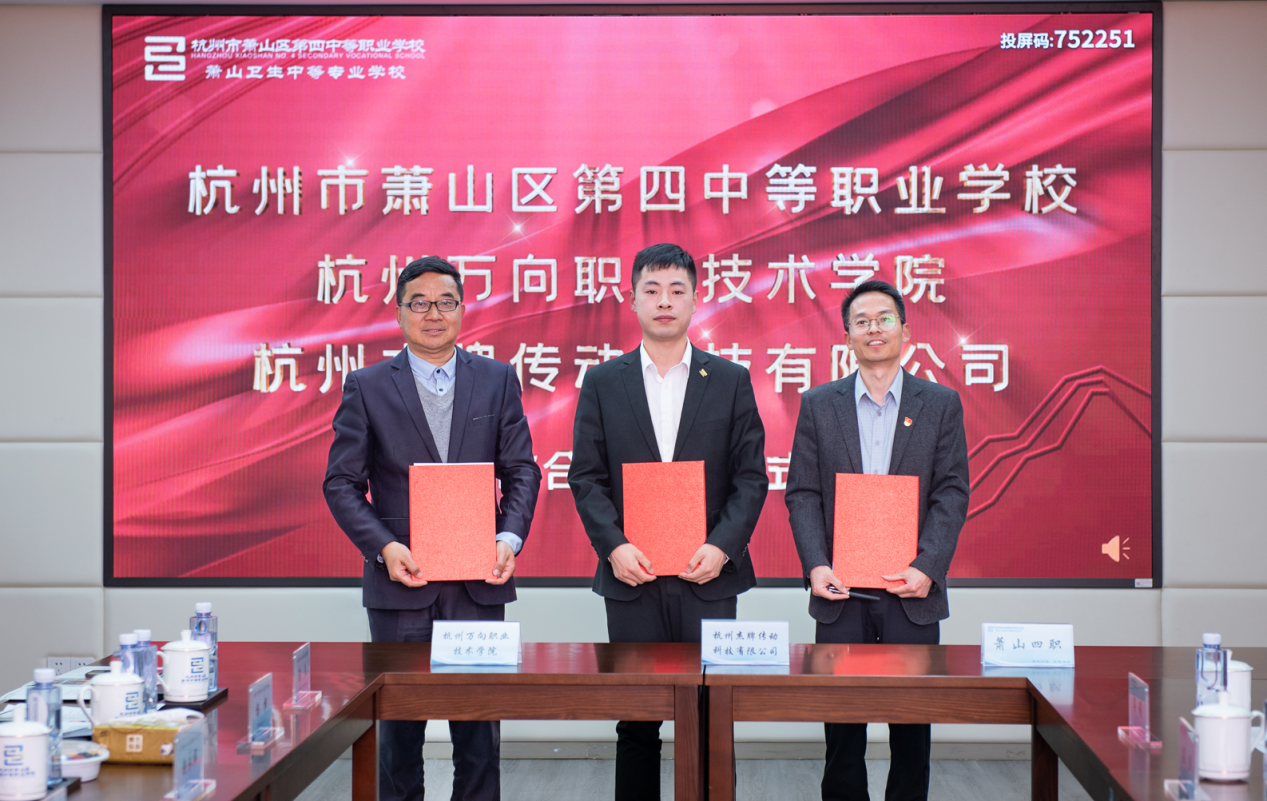 牟惠康院长在致辞中表示,这次活动是“上”接天线、“下”接地气有意义的大事。党的二十大中第一次明确将职业教育作为一种类型写入报告,如何形成真正的职业教育特色这个新命题,在新时代需要我们作出更好更高的回答。以中国特色学徒制,中高职一体校企紧密协同育人,探索职业教育类型特征是二十大赋予我们的重要使命。此次校企协同、中高一体共建智能制造产业学院,推进中国特色学徒制的人才培养,是职业教育、高等教育、继续教育的协同创新,回答了高质量的职业教育如何做的问题,为职业教育发展提供了一个有意义的样本。希望以这次签约仪式为起点,在校企协同育人、中高一体育人、科教融汇育人三个方面有新推动、新作为、新贡献。会上萧山区第四中等职业学校校长王林毅、万向一二三股份公司副总经理任尊茂、杭州杰牌传动科技有限公司招聘经理沈杰分别作了讲话。