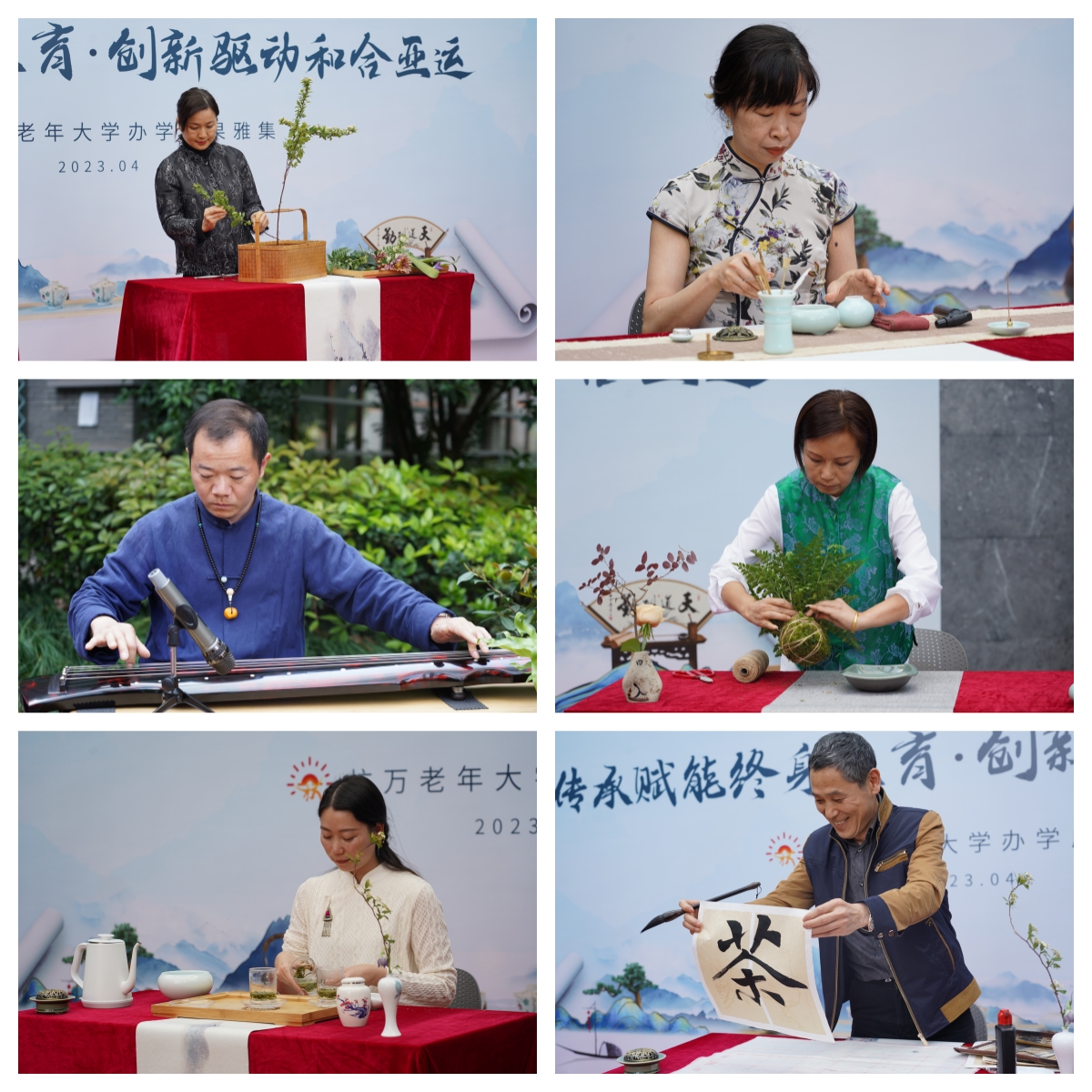 花艺、香艺、园艺、书法、茶艺,杭万老年大学的师生代表们轮番上台,精彩纷呈的技艺展示让人看得惊叹连连,现场琴声阵阵、香气四溢、掌声不断,充分展现了我院老年教育老有所学、老有所乐、老有所为、老有所养的丰硕成果。