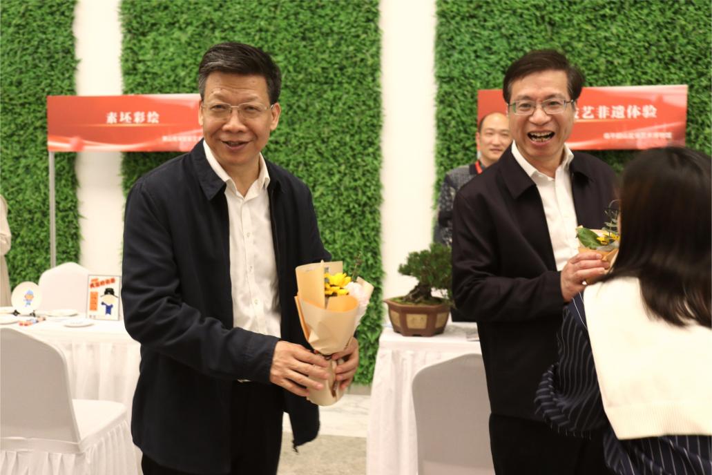 学院老师为浙江省人大教育科技文化卫生委员会主任委员陈根芳(左)、浙江省社科联党组书记、副主席郭华巍(右)献上小花束