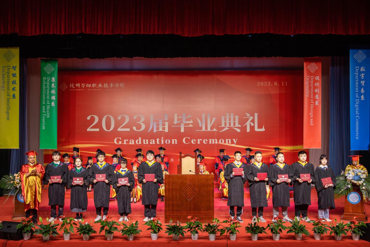 随后智能技术系、康养旅游系、设计创意系、数字贸易系各教研室主任逐班宣读毕业生名单,由主礼嘉宾牟惠康院长授予毕业资格,并逐一为省优秀毕业生颁发毕业证书。