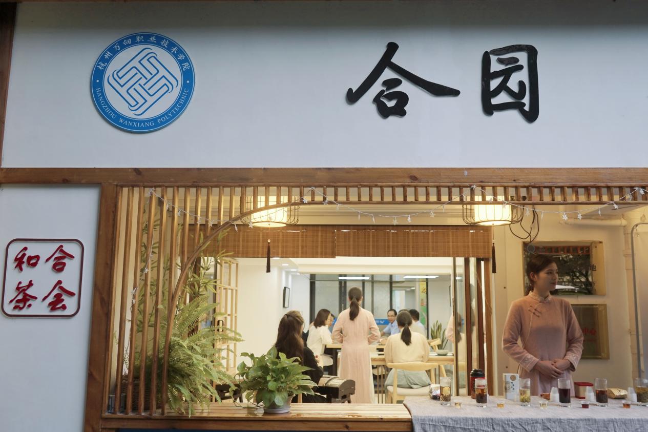 窗外雨声淅沥,来来往往人潮涌动;屋内弦声绕梁,满座宾朋举杯品茗。一动一静在飘溢的茶香中形成联系,从而达到声形之间的美妙和谐。合园的“合”字本身就有聚集、美好、杰出的寓意,一和一合间便是茗茶品鉴活动的钧谐融合,也是学院和合文化的写实呼应。