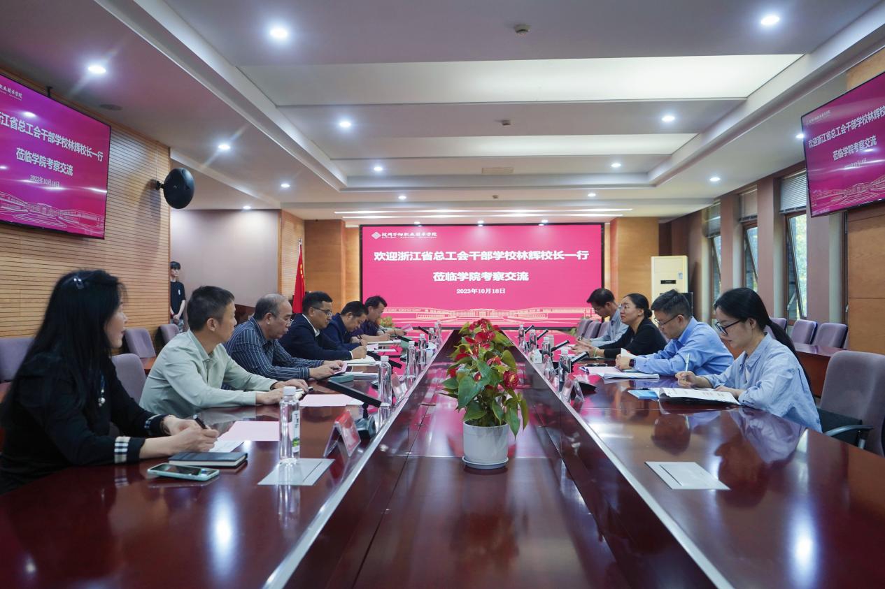 10月18日下午,浙江省总工会干部学校校长林辉一行莅临我院考察,学院院长牟惠康,党委副书记、副院长朱仁学及相关部门负责人陪同考察。双方在二号校区6216会议室就推进合作展开深入交流,会议由院长牟惠康主持。