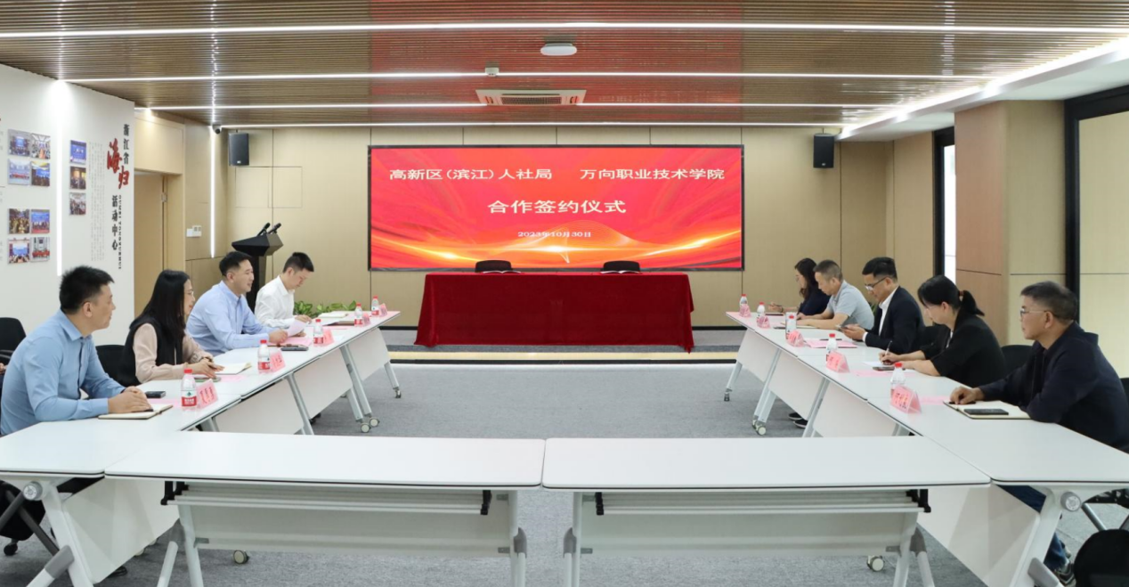 10月30日下午,学院与高新区(滨江)人社局举行了合作签约仪式。高新区(滨江)管委会副主任、副区长洪潮,区人社局、教育局领导,学院院长牟惠康,相关部门负责人参加签约仪式。