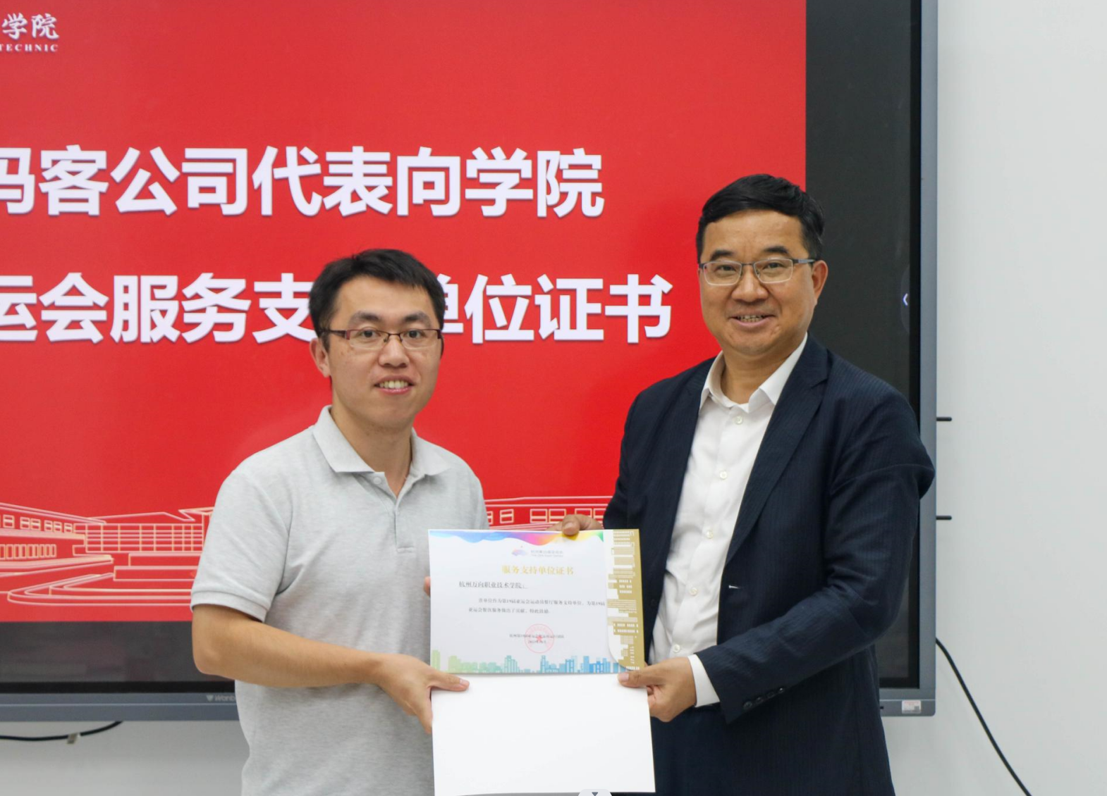 我院学生志愿者在亚运会上的服务得到了亚组委的认可,学院院长牟惠康和爱玛客公司代表张健峰经理、诸樱枝经理为学生志愿者颁发了亚组会的志愿者纪念证书。
