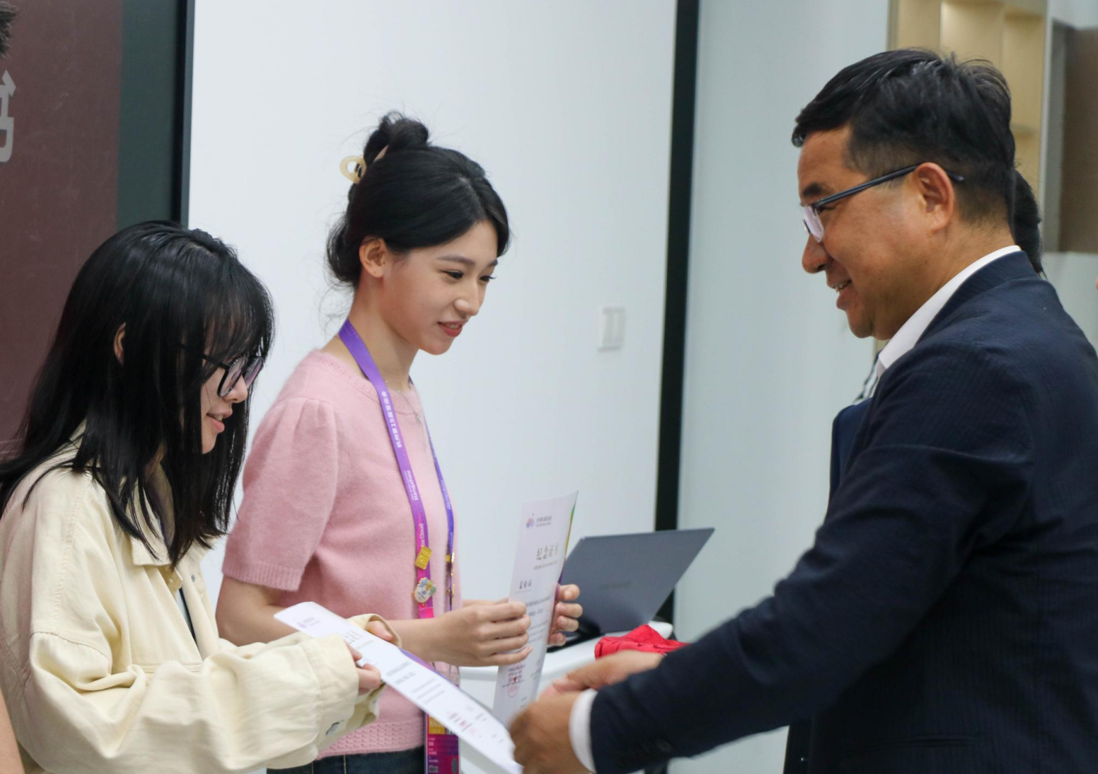 爱玛客公司张健峰经理向学生志愿者颁发亚组会志愿者纪念证书