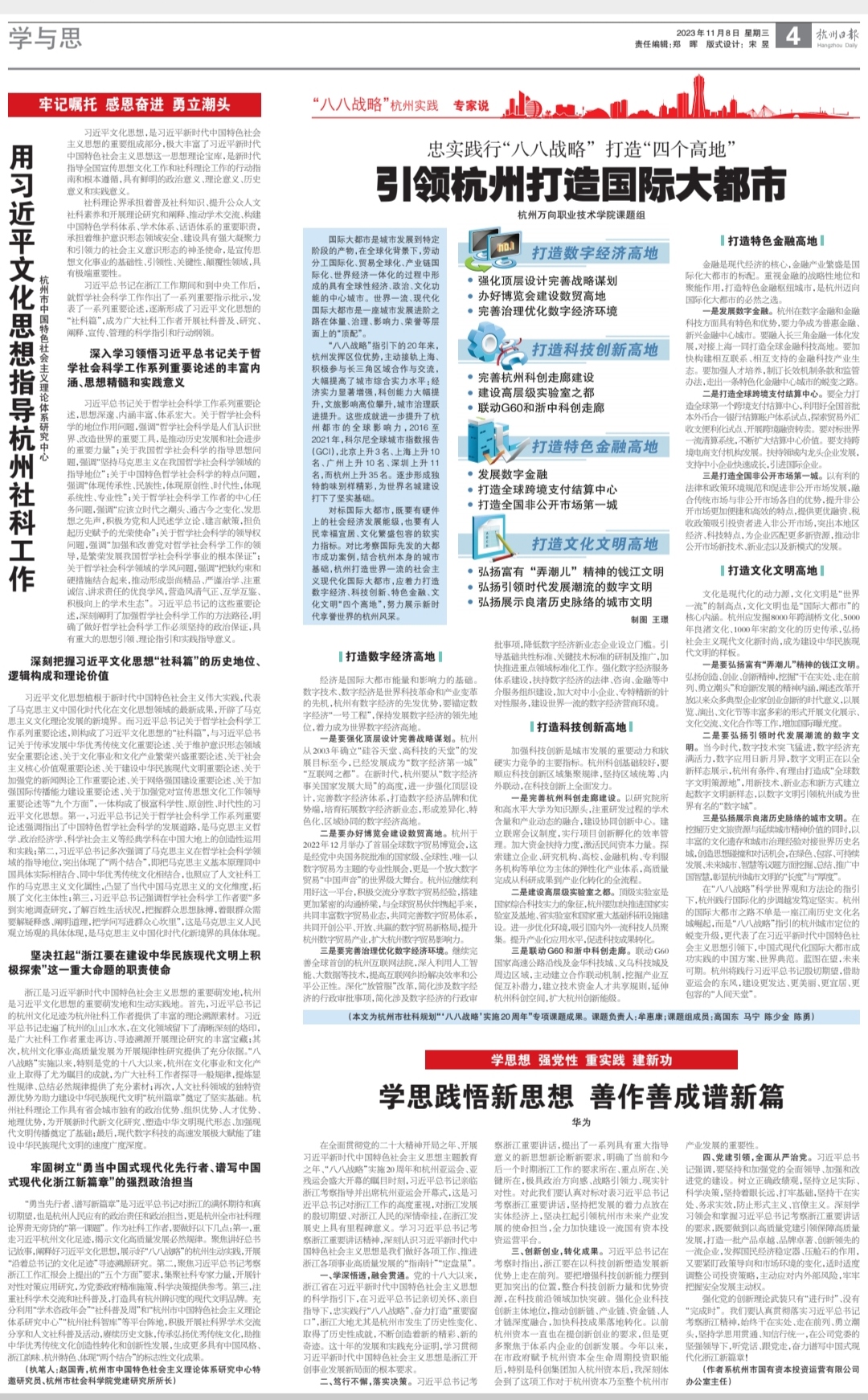 11月8日,由我院课题组撰写的“八八战略”实施20周年研究成果《忠实践行“八八战略”,打造“四个高地”,引领杭州打造国际化大都市》,获《杭州日报》理论版(学而思)刊发。该成果是我院推行“科研兴校”战略,广泛开展杭州城市品牌研究,发动教师学习“八八战略”深刻内涵的标志性成果。
