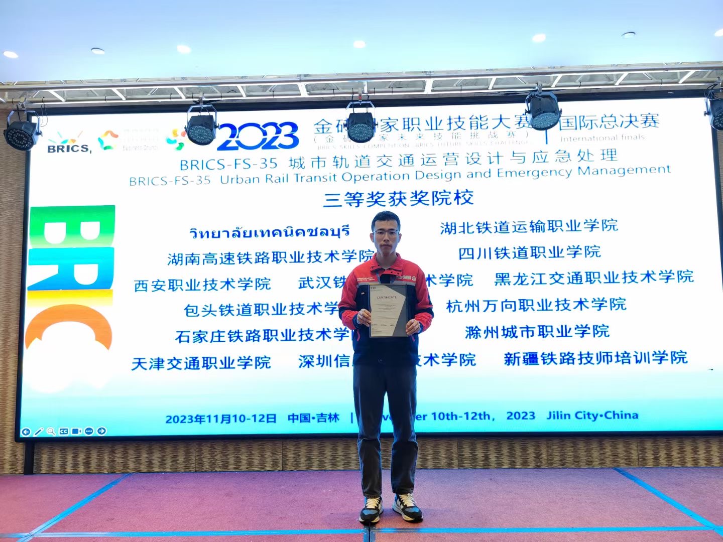 11月12日,2023金砖国家职业技能大赛“城市轨道交通运营设计与应急处理”赛项国际总决赛在吉林铁道职业技术学院落下帷幕。我院智能技术系城市轨道交通运营管理专业学生沈健在王苏芳、杨文远老师的精心指导下,经过激烈角逐,获得三等奖。
