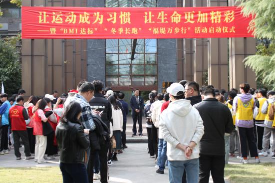 为响应“健康中国”战略,提高师生对健康的认知和健康水平,培养健康生活习惯。11月29日中午,学院在二号校区图书馆前举行“BMI达标”“福堤万步行”“冬季长跑”体育“三大行动”启动仪式。学院院长牟惠康、相关系部负责人及体育教研室全体教师出席,各系学生代表百余人参会。仪式由学生处处长杨人卫主持。