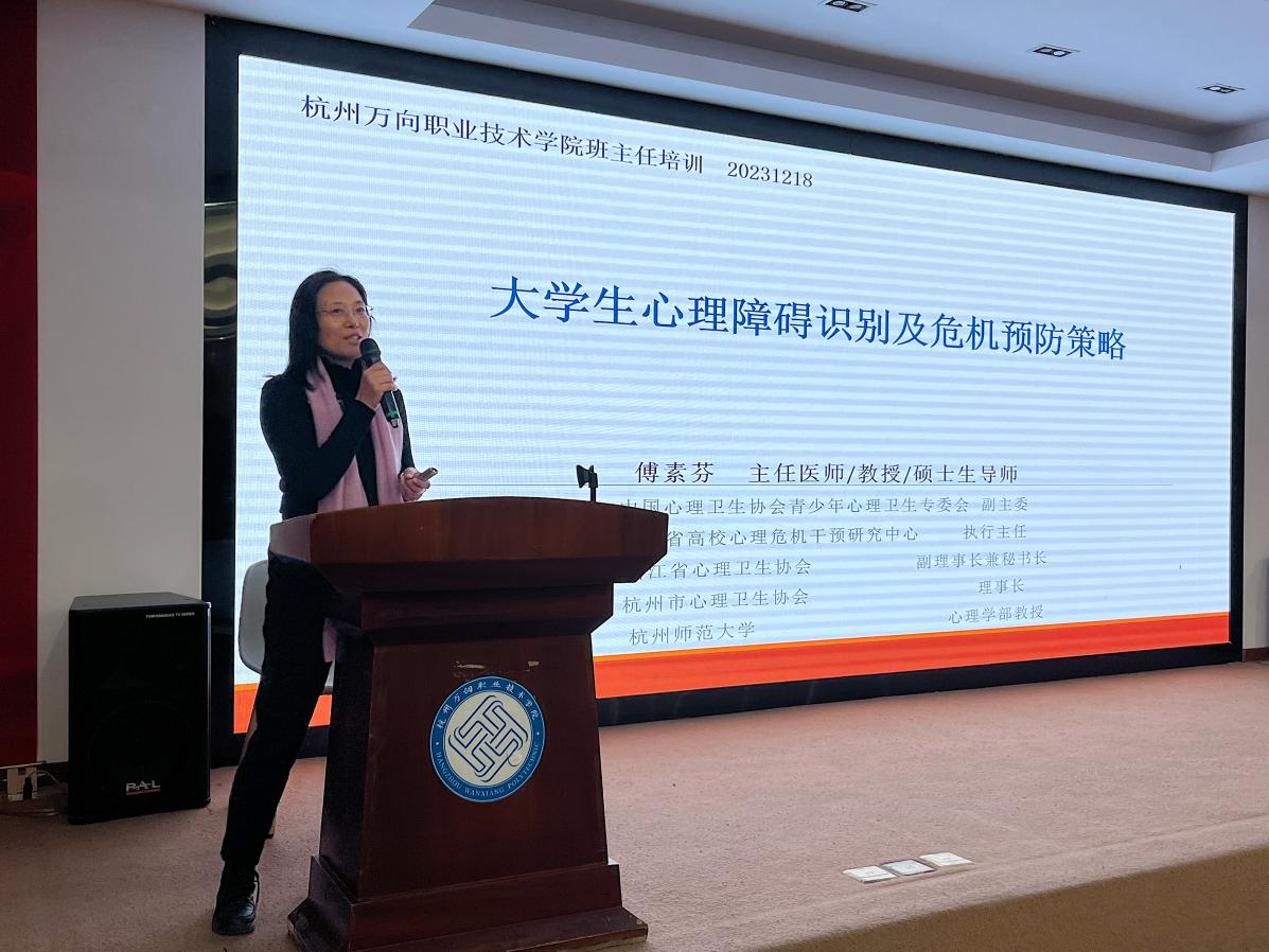此次培训邀请了中国心理卫生协会青少年心理卫生专委会副主委、浙江省高校心理危机干预研究中心执行主任、浙江省心理卫生协会副理事长兼秘书长、杭州市心理卫生协会理事长傅素芬教授来校做《大学生心理障碍识别及危机预防策略》的专题讲座。傅教授以案例入手,从学生心理障碍识别技巧、心理危机的预防策略两方面开展工作指导,帮助班主任老师理解学生“心理体检”项目、学习心理辅导中的技巧、识别学生心理危机信息与预防策略。傅教授还积极与班主任老师互动,现场解答班主任老师的提问,教给老师们“三调放松法”,引导老师们对自身情绪进行保健。