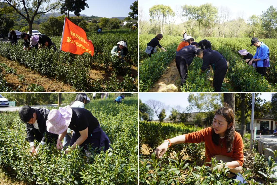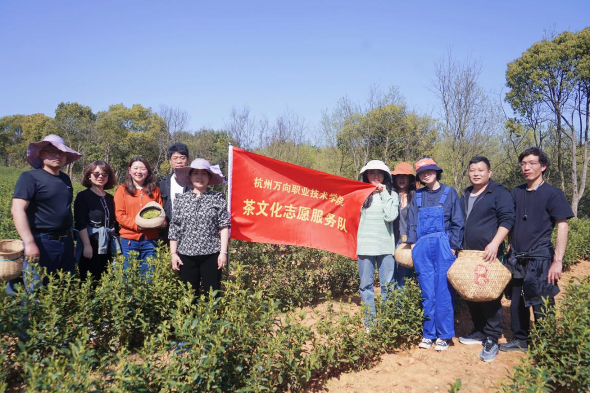 风和日丽的渤兰湾,春光洒在绿水青山间,飘扬的万向学院茶文化志愿服务队旗帜下,志愿者们草帽头上戴、茶篓腰上系,穿梭于亩亩茶田中。