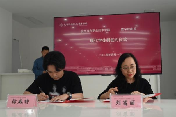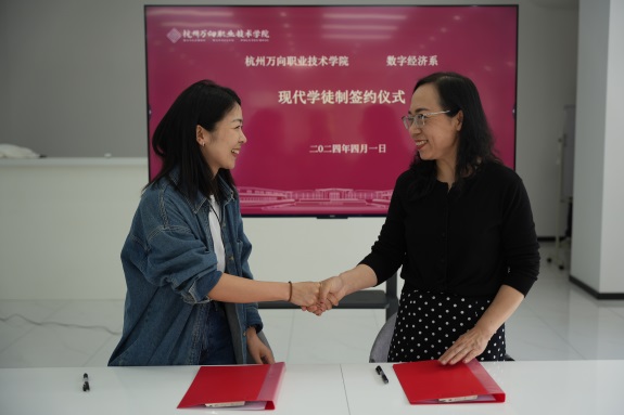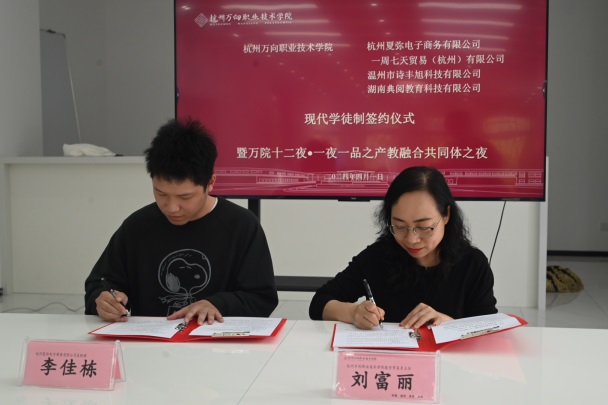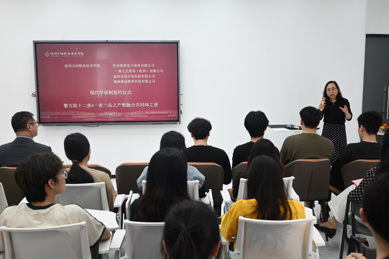 为深化产教融合,推进跨境电商专业建设,努力培养符合产业需要的高素质应用型、复合型、创新型人才,促进毕业生高质量就业,2024年4月1日下午,我院数字经济系跨商专业携手杭州夏弥电子商务有限公司、一周七天贸易(杭州)有限公司、温州市诗丰旭科技有限公司、湖南典阅教育科技有限公司举行现代学徒制签约仪式。学院数字经济系主任刘富丽、交流合作处副处长胡颖、数字经济系副主任唐夏韵、数字经济系副主任郑志柱、大数据与会计教研室主任沈应仙、公共外语教研室主任韩晓华、国际经济与贸易教研室主任助理陈然及跨境电子商务教研室主任助理翟华锋与跨境电商专业达人班学生近50人参加了本次活动。