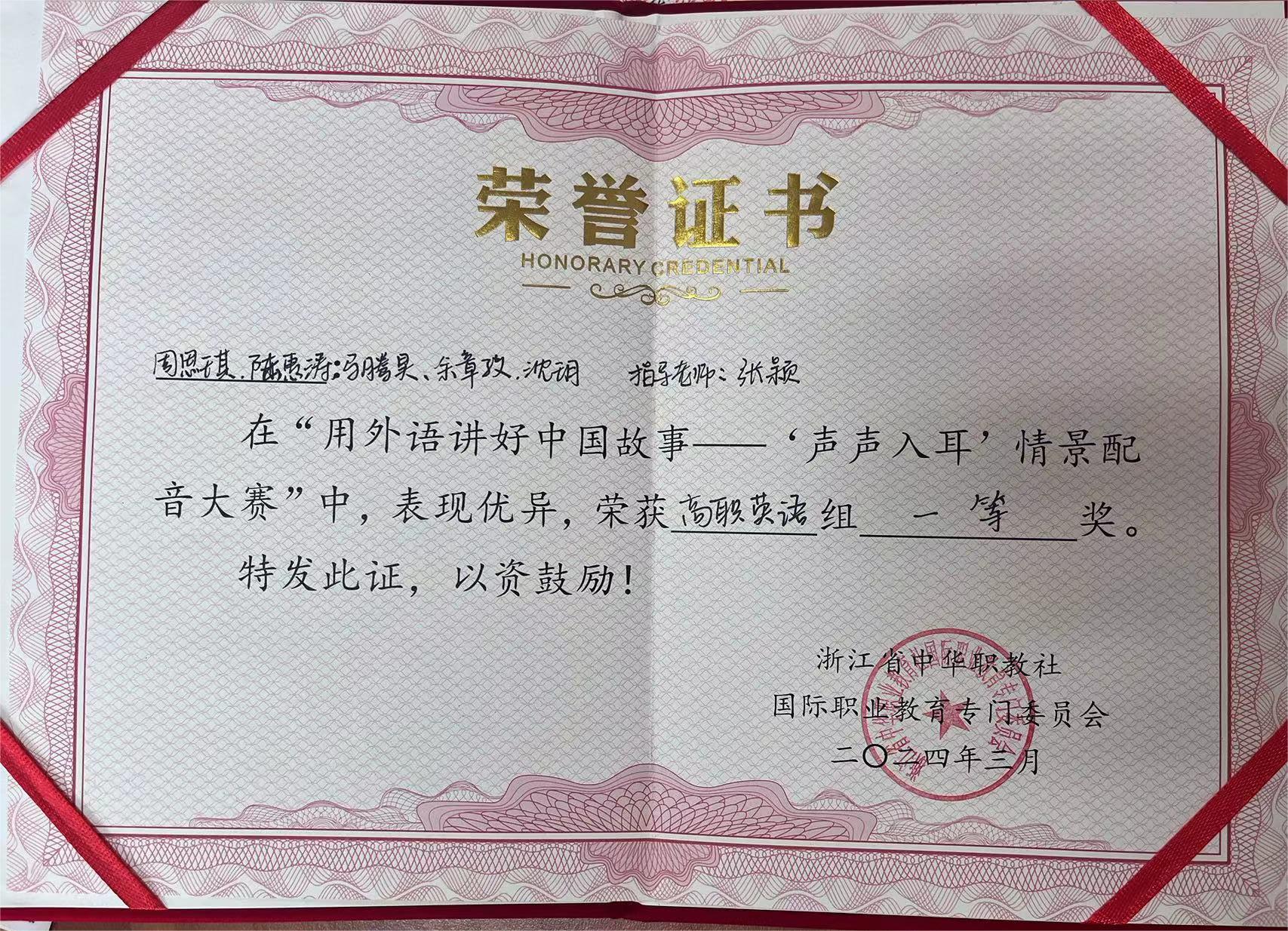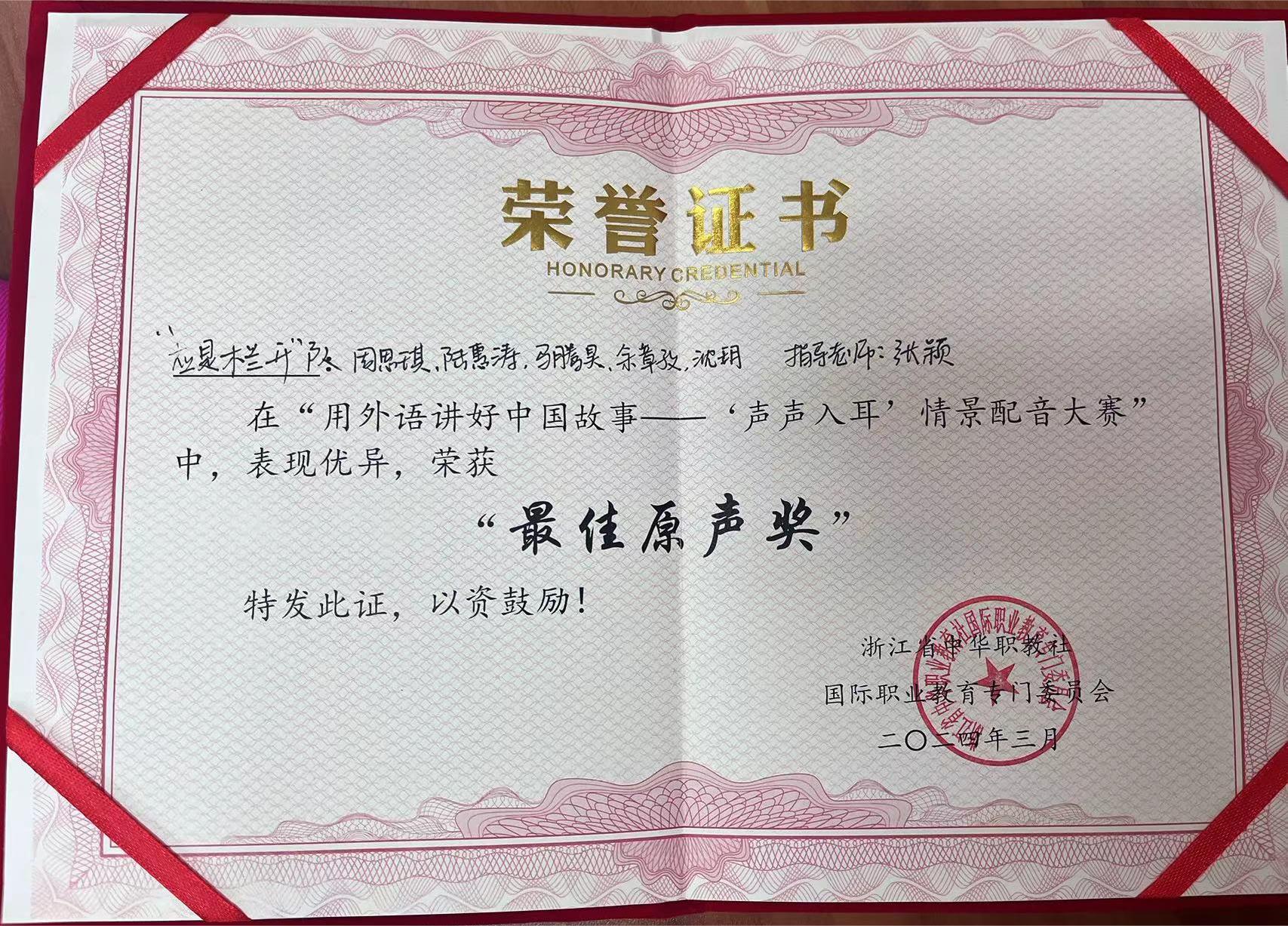 3月21日,由省中华职教社国际职业教育专门委员会主办,宁波行知中等职业学校、AICC国际教育中心承办的用外语讲好中国故事——情景配音大赛总决赛在宁波行知中等职业学校落下帷幕。我院公共英语教研室张颖老师指导的、由周思琪(商务英语22-2班)、余章孜(商务英语22-1班)、马腾昊(工商22-1班)、陆惠涛(机电22-4班)、沈玥(工商23-3班)组成的“应是木兰开”代表队,以地道流畅的英语表达能力和精彩的演绎能力,获得高职英语组总决赛一等奖,并斩获团队奖——“最佳原声奖”。