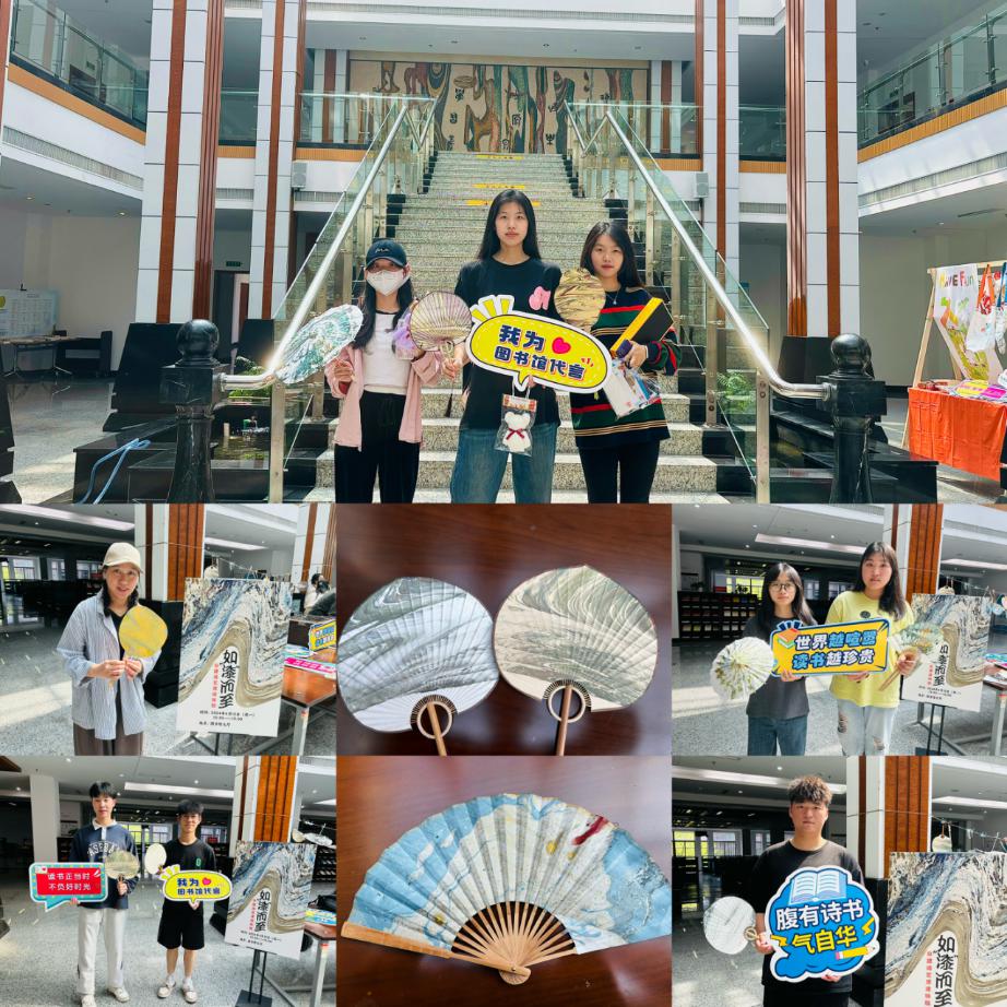 与此同时,如“漆”而至——非遗漆艺漂漆体验活动则成为全场的焦点,受到了师生们的热烈欢迎。大漆,又称中国漆,是一种天然树脂涂料,源于中国,已有八千年历史。大漆技艺被列入国家非物质文化遗产名录,与茶叶、丝绸、瓷器一样,代表着中国的古代文明,也体现了人类对美丽的追求和创造。漂漆是指以中国非物质文化遗产——大漆技艺为基础,结合现代创意和设计,制作出的一种具有艺术性和实用性的文创产品,在图书馆老师的耐心讲解下,大家对非遗大漆工艺的了解越发深入。同学们跃跃欲试,纷纷拿起准备好的空白扇面、纸伞等,在老师们的指导下开始着手制作。以漆作笔,以水作画。厚重又朴拙的大漆,在水中竟有了水的灵动与飘逸。时光仿佛在此刻也慢下来,驻足欣赏。当一把把漆扇于水中诞生,同学们难抑欣喜,每一个作品都是独一无二的,散发着独特的魅力,极具生命力和创意,师生们非常开心在非遗文化的邂逅里收获了一份专属于自己的礼物,同时深深领略到中国传统美学韵味。