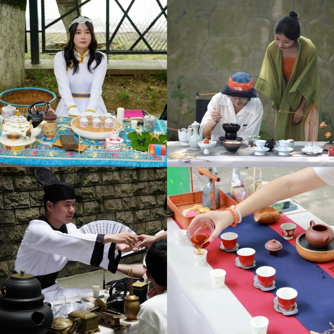 与此相应的是“茶市”,该展区展现了如西湖龙井、碧螺春、毛尖、瓜片及紫笋茶等全国20多个品种的大茶类。同时,更精心打造出“一带一路”茶席、“太白茶坊”、“梦华录”等情景式特色茶馆,学生不仅能在此品鉴到丝绸之路上不同国家的茶饮传统,也能穿越古今,与NPC角色互动,体验古法炒茶、宋代点茶等技能,从识茶叶、品茶味,到聆听茶故事,“三创·小满集”以创新而多元的维度,带师生们解读“茶”——这一重要的中华文化名片。