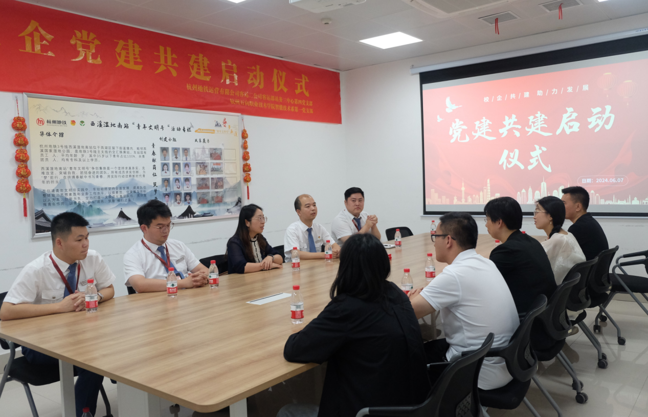 为全面贯彻习近平新时代中国特色社会主义思想,落实新时代党的建设总体要求,发挥党组织的主体作用,更好发挥党建引领,释放党建聚合效能。2024年6月7日下午,学院智能技术系第一支部委员会与杭州地铁运营有限公司客运二公司客运部站务三中心第四支部委员会在杭州地铁三号线西溪湿地南站举行了党建共建签约仪式。杭州地铁客运二公司客运部副部长杨琴英、学院智能技术系党总支书记何瑛、客运二公司客运部站务三中心第四党支部书记杨成威、智能技术系第一党支部书记叶海芬出席签约仪式。列席本次活动的有签约共建两支部的支部委员、学院城市轨道运营管理专业教研室主任等。