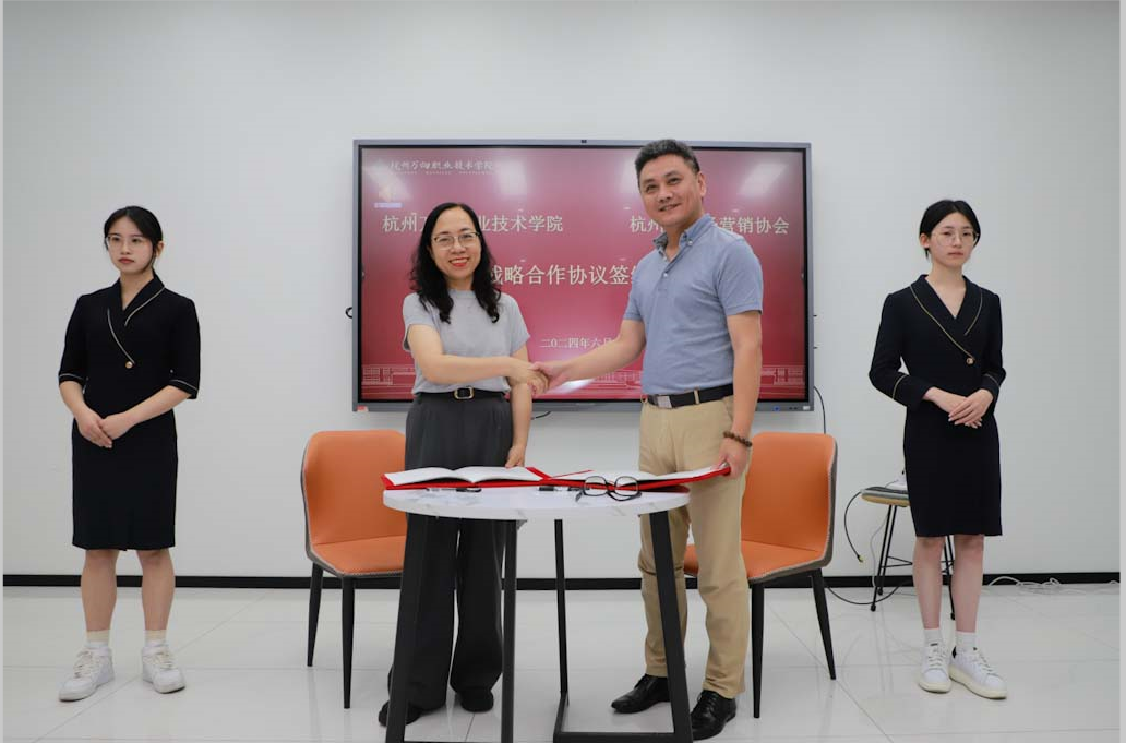 6 月18日晚,学院与杭州市市场营销协会战略合作签约仪式在28号国际驿站举行。杭州市市场营销协会秘书长吴伟、监事蒋胜蓝、数字经济系主任刘富丽教授及相关负责人、学生代表参加。