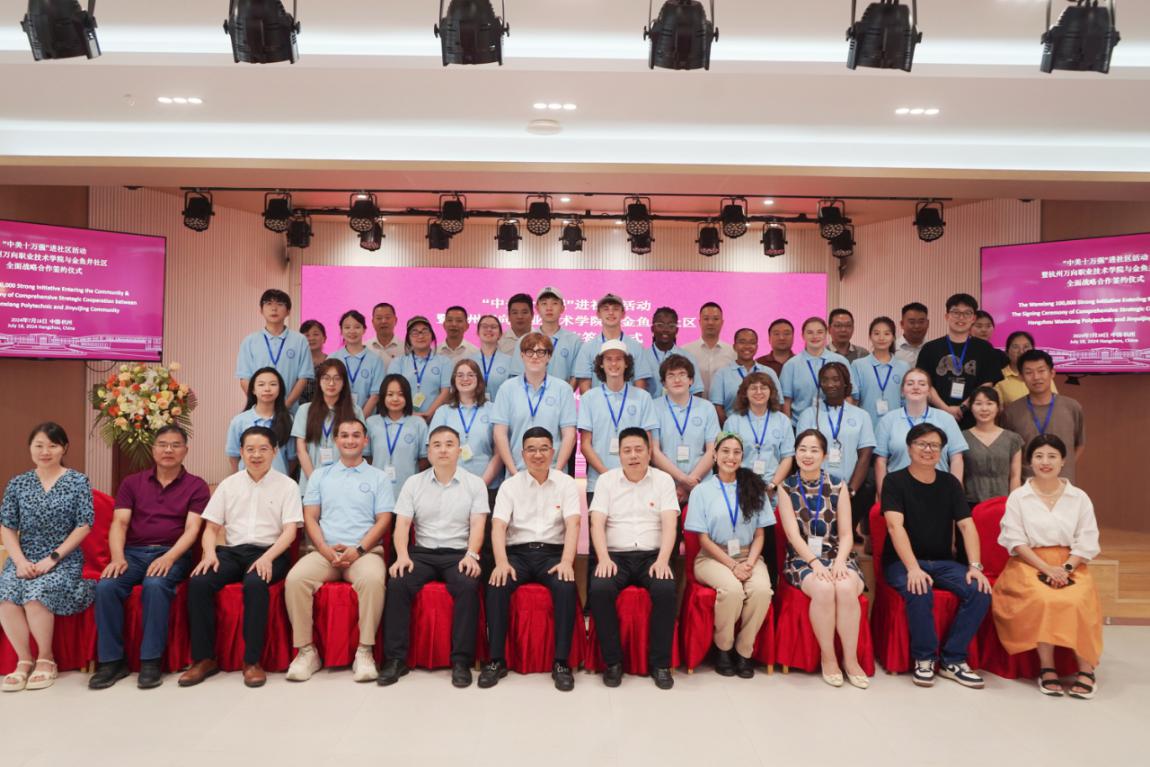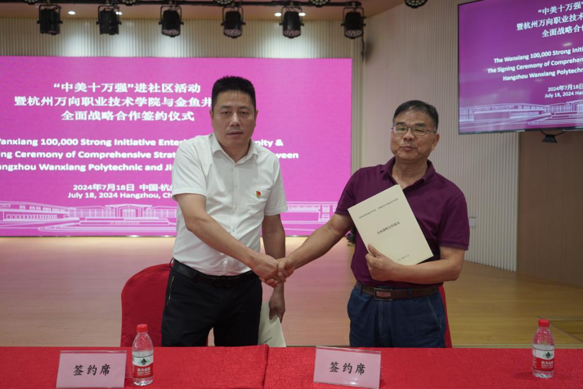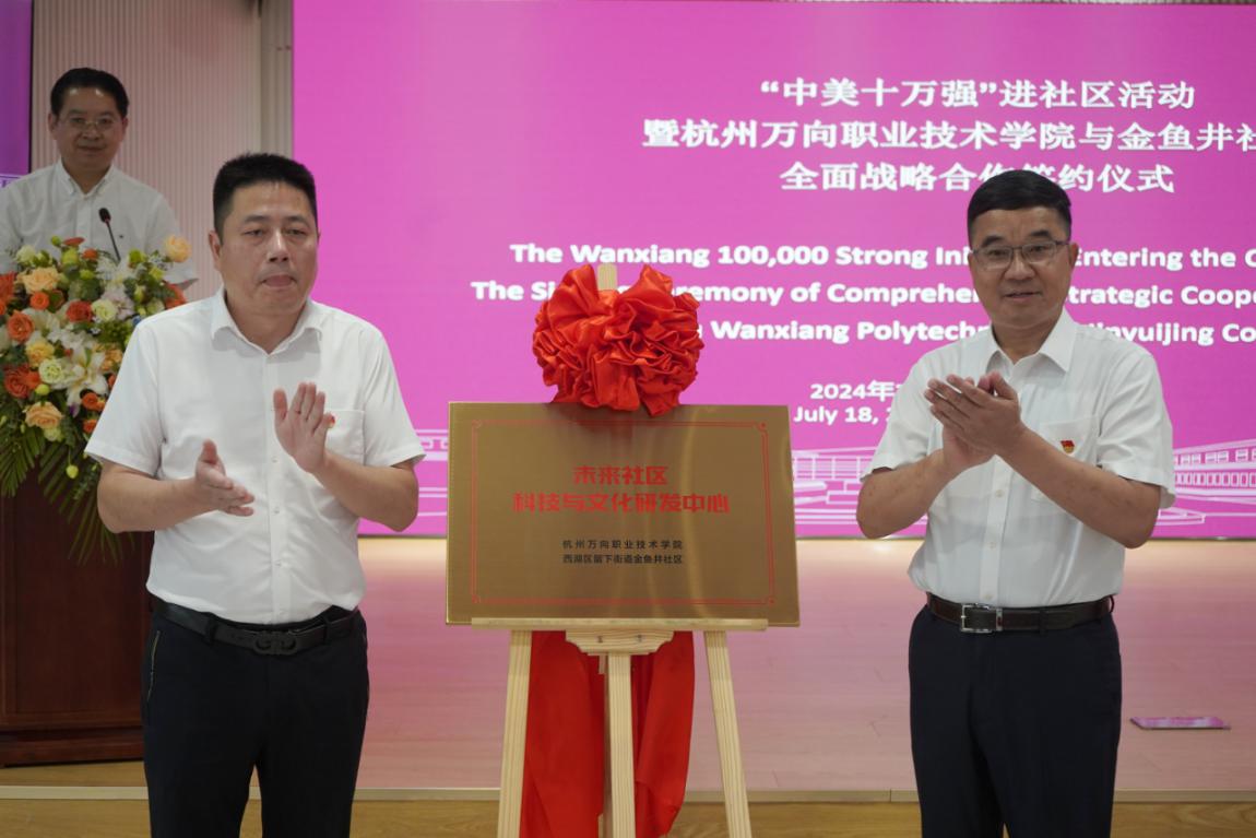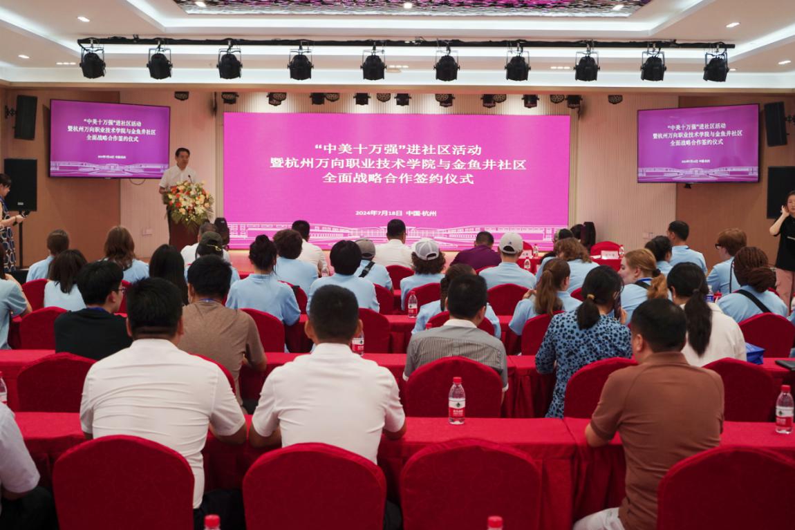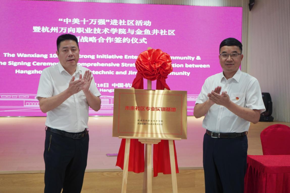 7月18日下午,学院与留下街道金鱼井社区共同举行全面战略合作签约仪式暨“中美十万强”进社区活动,学院院长牟惠康、金鱼井社区党委书记陈勤华等相关领导出席,万向“中美十万强”师生代表参加。会议由学院副院长朱仁学主持。