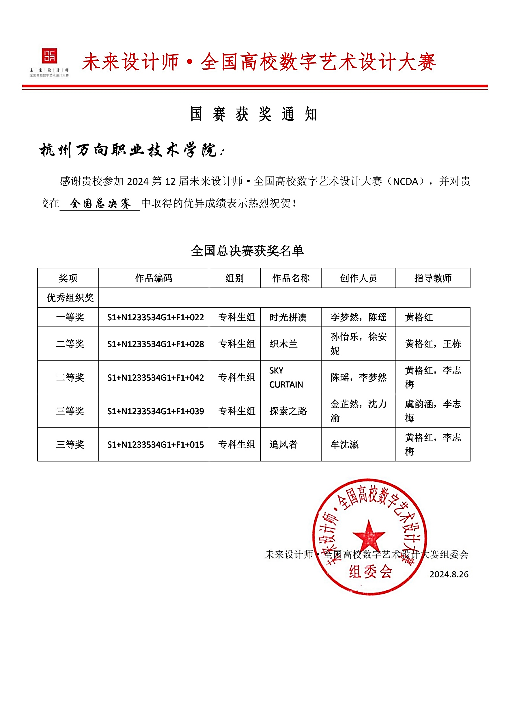 近日,2024第12届未来设计师·全国高校数字艺术设计大赛(NCDA)全国总决赛获奖名单正式公布,我院设计创意系服装设计与工艺专业学生在1891所参赛高校的近30万件作品中脱颖而出,再获全国一等奖1项、二等奖2项、三等奖2项,浙江赛区一等奖5项、二等奖6项、三等奖7项的优异成绩。大赛组委会授予Beat365唯一官方网站全国总决赛 “优秀组织奖”和浙江省赛区“优秀组织单位”的殊荣,李志梅老师、黄格红老师、虞韵涵老师、王栋老师获全国总决赛“优秀指导教师”,刘士瑾老师获“优秀组织教师”。同时,全国一等奖作品入选联合国教科文组织主办的未来设计师·国际创新设计大赛(IIDA)进行角逐。