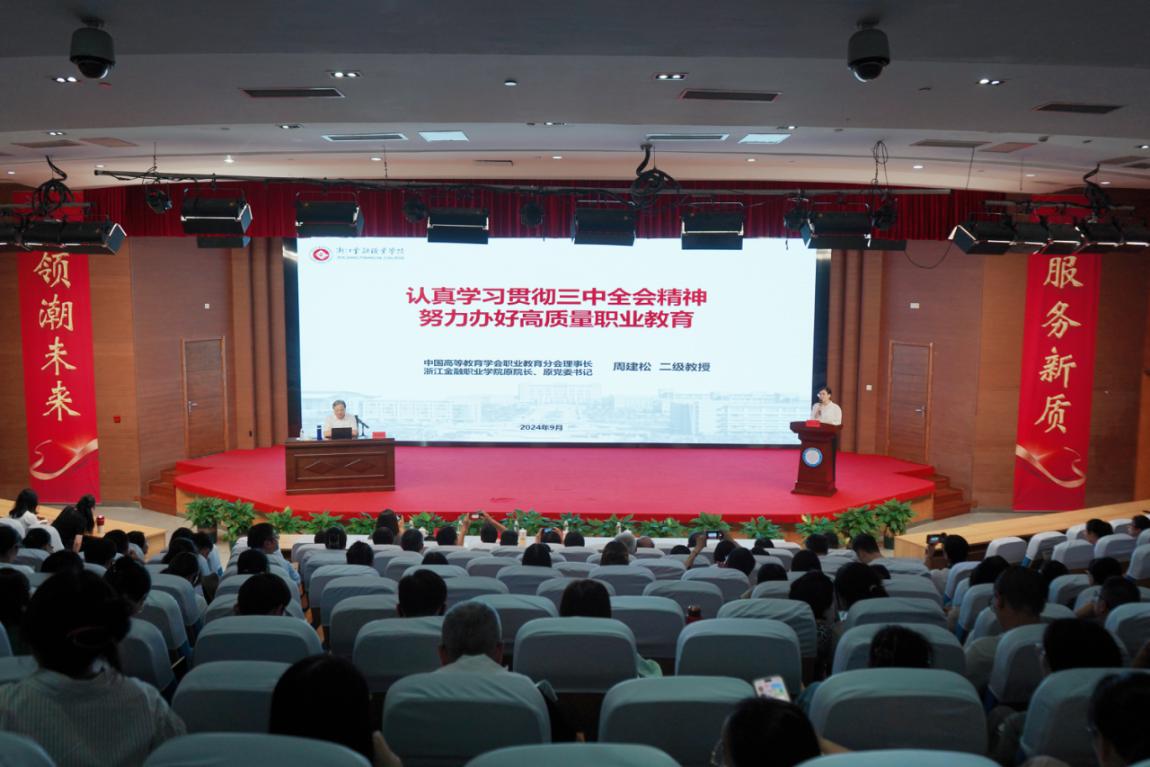 9月23日下午,我院在小报告厅举办《认真学习贯彻三中全会精神,努力办好高质量职业教育》专题讲座,作为本年度“科艺提质”系列讲座的重磅内容,学院特邀中国高等教育学会职业技术教育分会理事长,浙江金融职业学院原院长、原党委书记周建松教授讲解。学院全体教职工参加,讲座由科研督导处副处长陈少金主持。