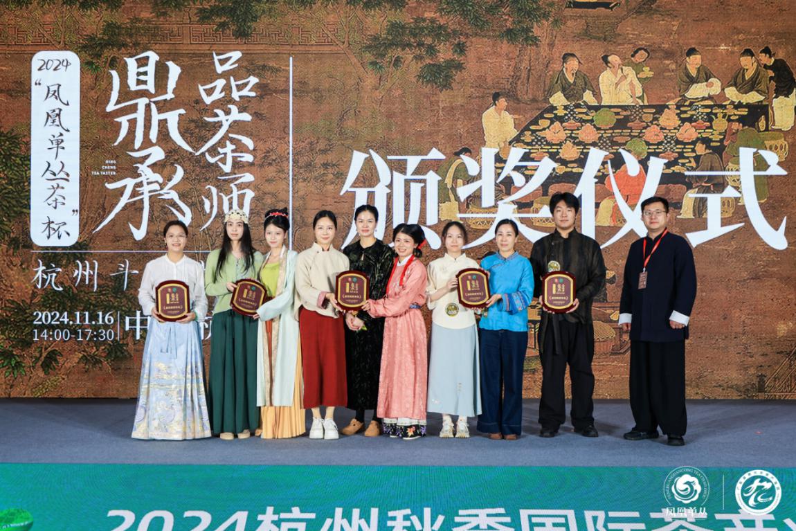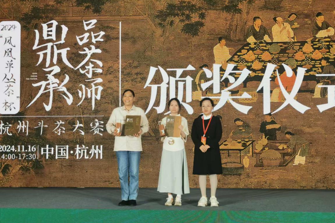 此外,学院茶文化研究中心组织师生参加了11月16日举办的2024“凤凰单丛茶”杯鼎承品茶师·杭州斗茶大赛。在茶文化研究中心副主任、茶道文化推广小组组长杨艳老师的指导下,“万向有茗”战队的十位同学身着中国传统服饰,与百余名专业茶艺师、茶文化爱好者同台竞技,展现了我院茶艺特色教育成果与学子的风雅茶韵。最终学院两人进入决赛,酒店231班林嘉如同学获得银奖,我院获颁“最佳组织单位奖”。