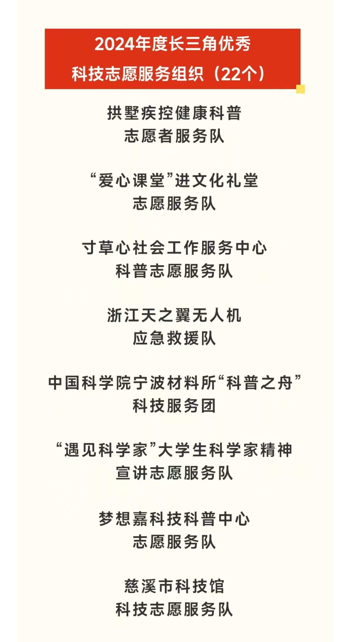 近日,长三角科技志愿服务联盟公布2024年度长三角科技志愿服务先进典型,我院“爱心课堂”进文化礼堂志愿服务队荣获“2024年度长三角优秀科技志愿服务组织”。
