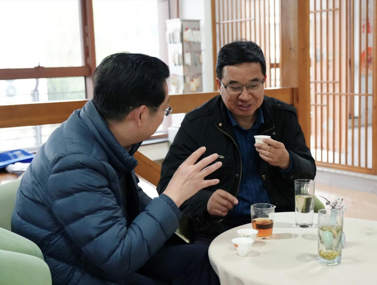 牟惠康院长、朱仁学副院长在现场交流品茶心得