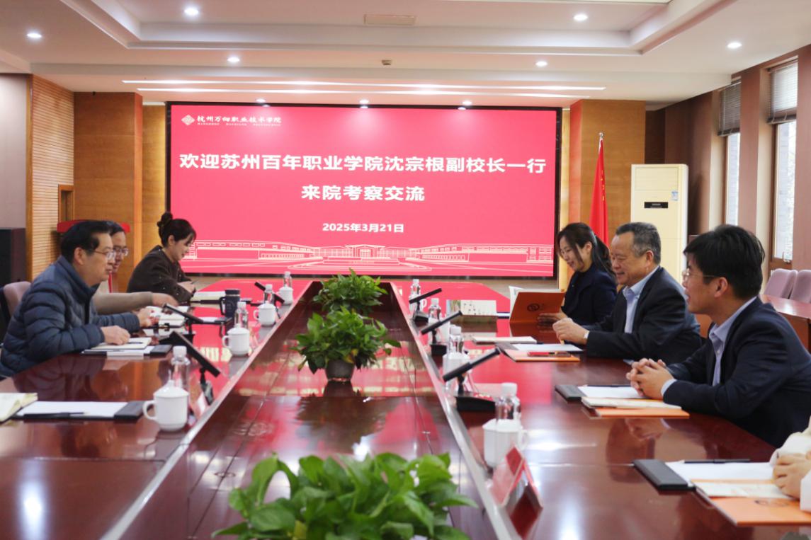 3月21日,苏州百年职业学院副校长沈宗根一行来院调研,实地考察“十万强”展示区、校史馆、数字经济系实训室,学院院长牟惠康、副院长朱仁学陪同考察交流。
