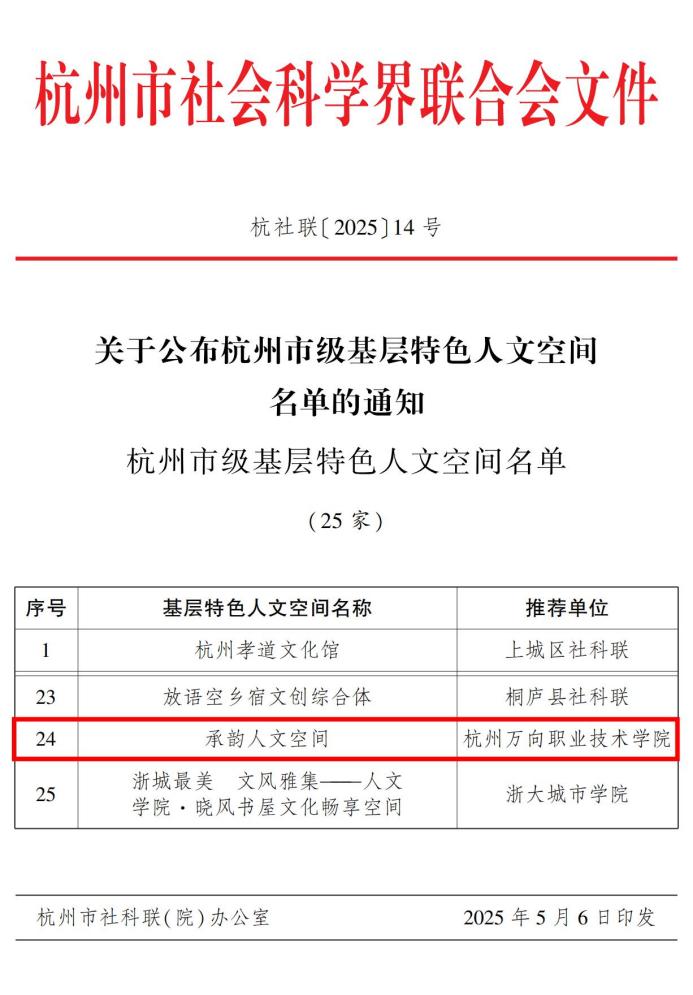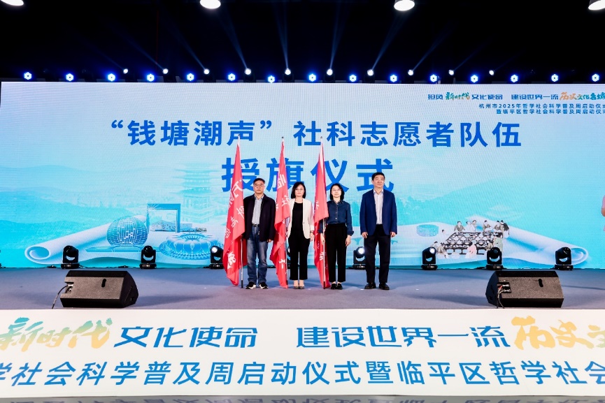 5月9日,杭州市2025年哲学社会科学普及周在临平艺尚小镇启动。开幕仪式上,我院“三维协作 文化惠民”项目入选市级精品推介项目,“承韵人文空间”成功入围市级基层特色人文空间,乡村振兴社科志愿服务队、“爱心课堂”进文化礼堂志愿服务队、西溪青屿社科志愿服务队等三支队伍获“钱塘潮声”社科志愿者服务队伍,并授队旗。
