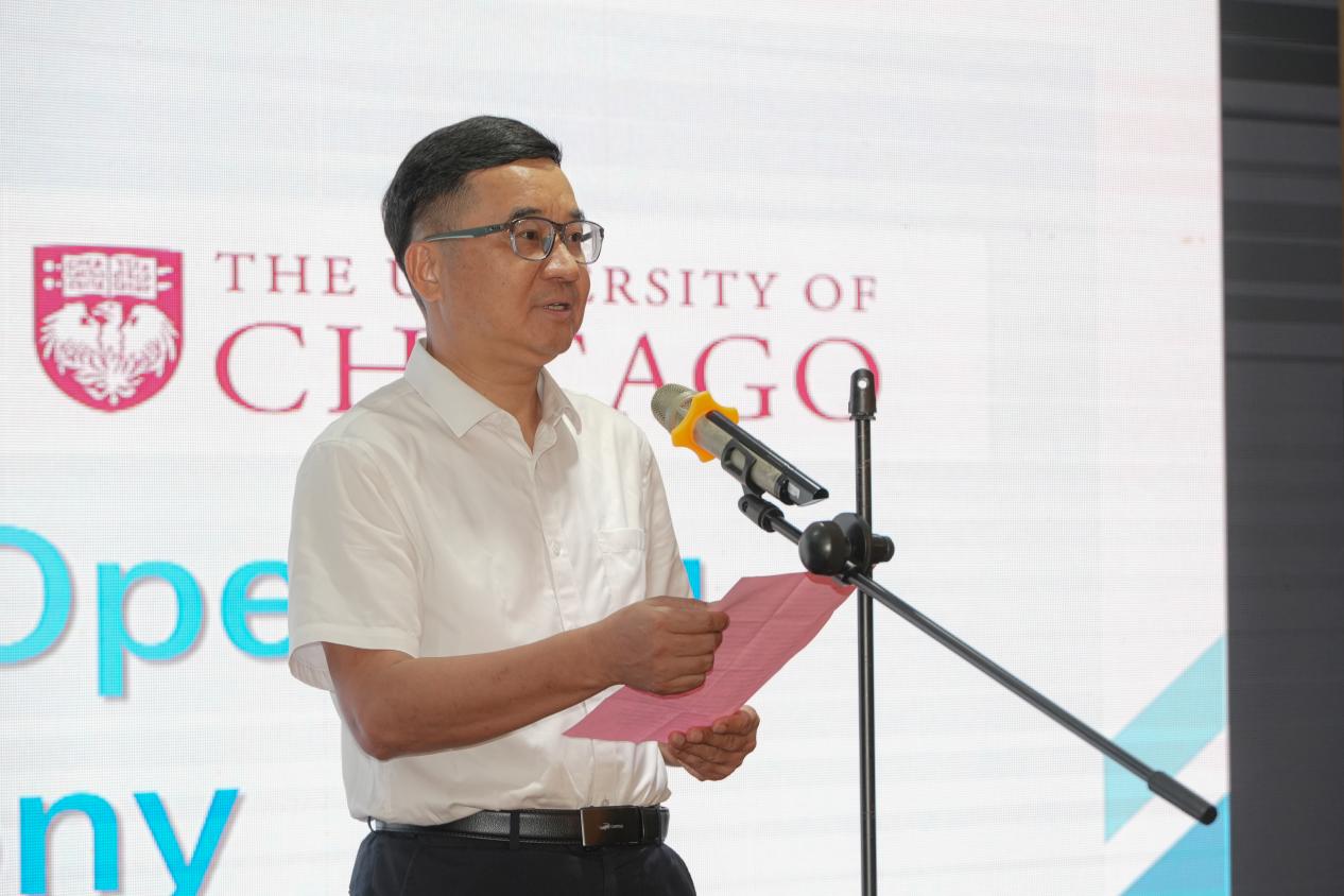 学院党委副书记、院长牟惠康出席开幕式并致辞。他简要介绍了学院的办学情况和万向“中美十万强”项目,高度肯定了芝加哥大学的办学成就和合作参与,他指出“今年是贵校参与万向‘中美十万强’项目的第九个年头,今夜的相聚,恰似老友重逢。本次研习将以清洁能源为主题,并按照全人教育理念,安排中国文化、现代治理、社区建设等课程。我相信,通过研学,大家会感受到一个真实、立体、全面的中国,一个生机勃勃、充满活力的杭州。”