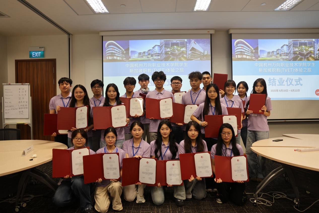 结业仪式上,学员们逐一分享感悟,结合创业课程的创意实践、领导力课程的协作体验及面试技巧训练,畅谈多维度学习对未来发展的深远影响。新加坡工艺教育局高级经理Yvonne Lian高度肯定学员表现,称赞大家在课程中的专注投入与跨文化互动中的出色表现。随后,她为每位学员颁发结业证书,见证成长。