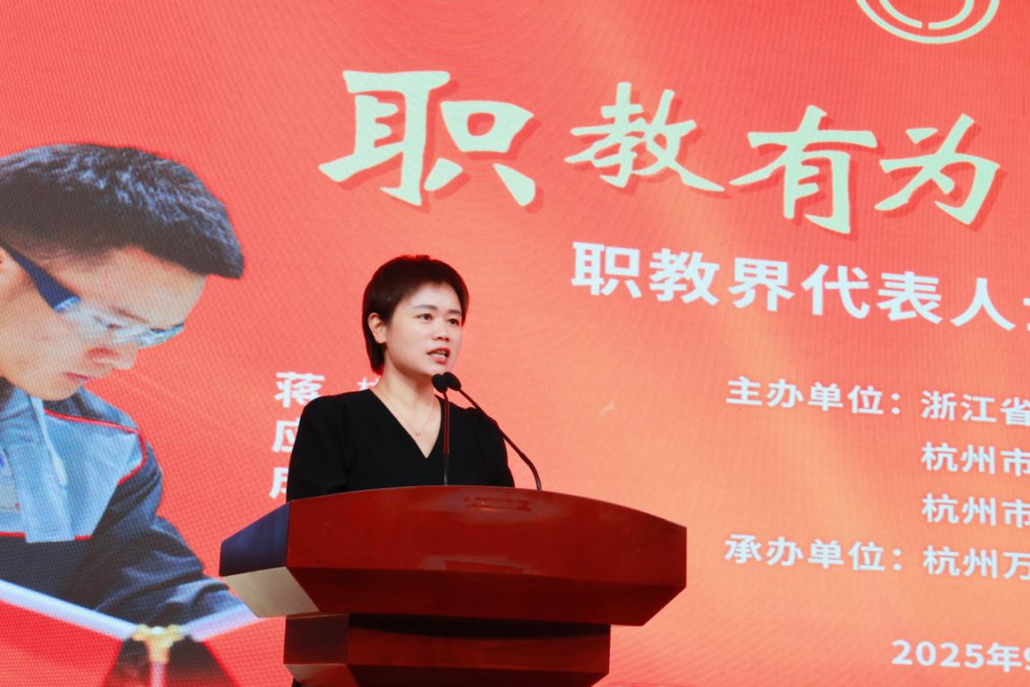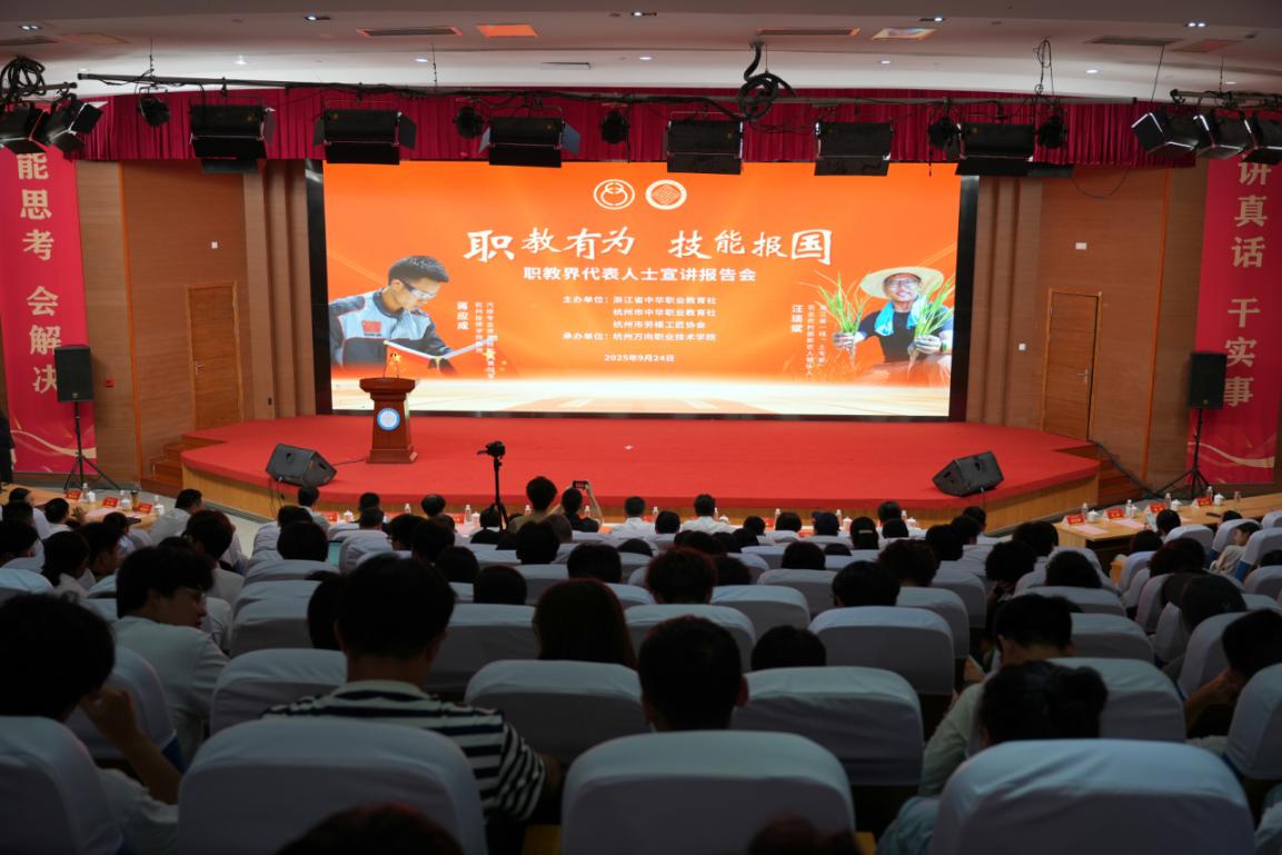 9月24日下午,“职教有为 技能报国”职教界代表人士宣讲报告会在我院成功举办。活动由浙江省中华职业教育社、杭州市中华职业教育社、杭州市劳模工匠协会主办,Beat365唯一官方网站承办。浙江省中华职业教育社副主任潘云峰,杭州市委统战部副部长、市中华职业教育社副主任罗明誉,市劳模工匠协会副会长郑桂岚,市教育科学研究院副院长、市中华职教社社务委员洪彬彬等省市领导莅临活动,学院党委副书记、院长牟惠康等院党政领导及三百余名师生代表参加。学院党委委员、宣传部部长应瑶主持活动。