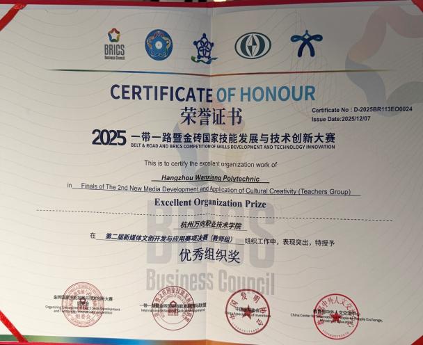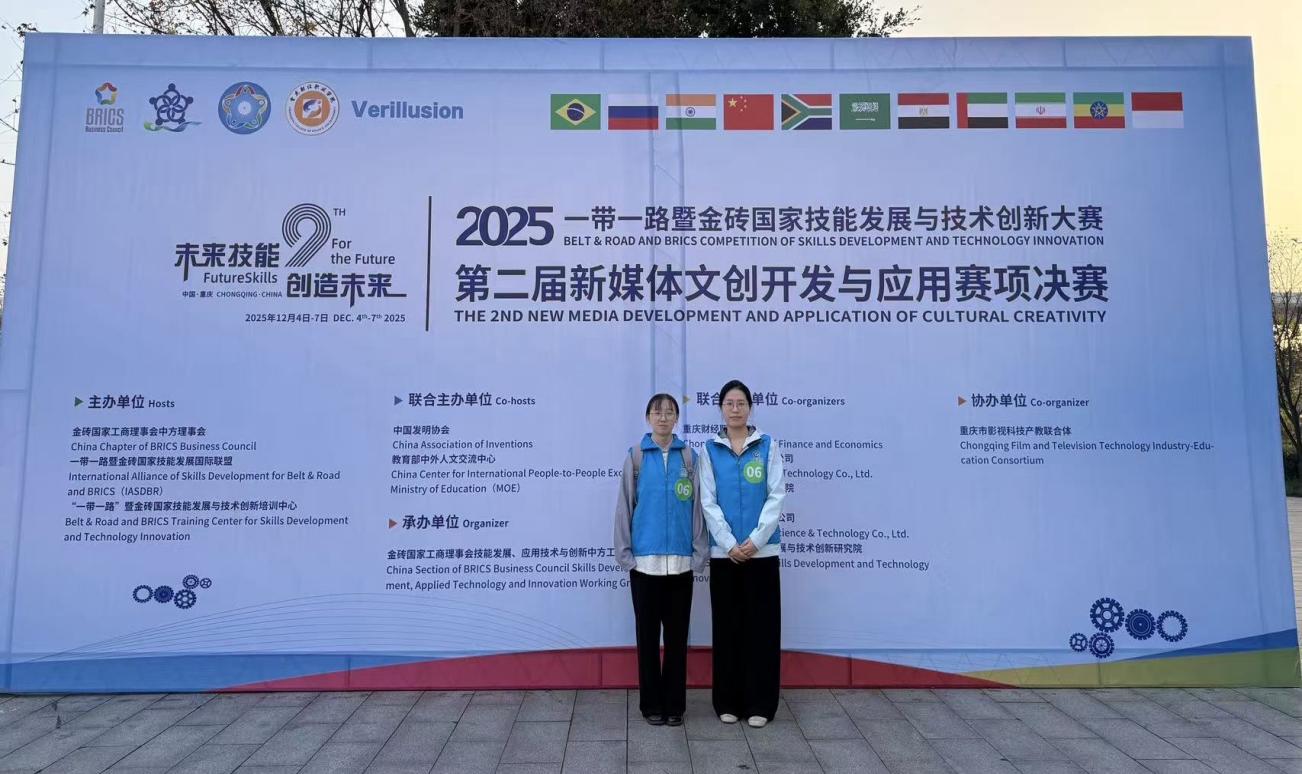 2025年12月6日,备受瞩目的2025年“一带一路”暨金砖国家技能发展与技术创新大赛之第二届新媒体文创开发与应用赛项决赛在山城重庆隆重开幕。在强手如林的比赛中,我院青年教师杨泽慧、井慧玲组成的教师组参赛团队凭借出色的专业素养和创新能力脱颖而出,荣获大赛二等奖。同时,学院也因出色的组织工作,被授予“大赛优秀组织奖”。
