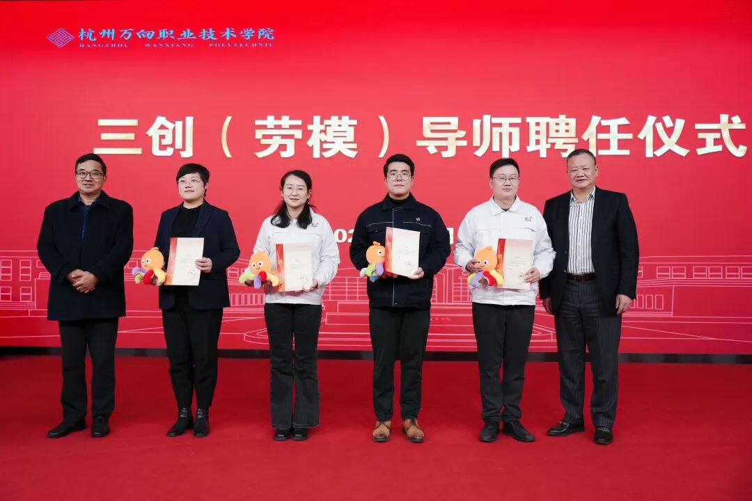 三创(劳模)导师聘任仪式上,管大源书记、牟惠康院长为来自万向集团一线杰出工作者、劳模代表魏芳芳博士、苏敏博士、严开先生、杨行先生颁发导师聘书和万院吉祥物“小七”。三创(劳模)导师的设立将促进学院三创育人、全人发展及核心素养培育。