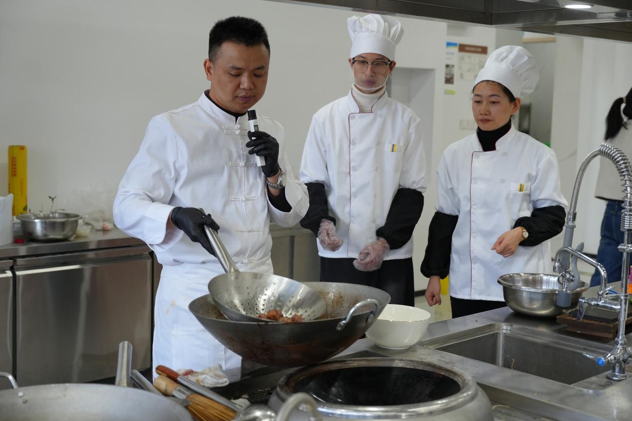 仪式结束后,绿色食品生产技术教研室王艳老师与企业导师吴顶旺共同呈现了一堂“创中学”新劳动教育成果融合示范课,王艳老师从菜品创新、菜单设计、成本核算等方面进行系统讲解,吴顶旺导师现场展示了宋韵文化融入菜肴创新的实践教学。