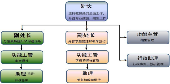 教务处是分管教学副院长领导下负责学院教学管理的职能部门,也是学院教学委员会的日常办公机构。主要负责执行学院的决定,对全院教学和招生工作进行计划、组织、协调、调研、参谋、控制和监督等管理与服务。教务处下设素质保障科、教学运行科和招生办公室三个科室,按管理岗位实施日常的教学和招生管理工作。