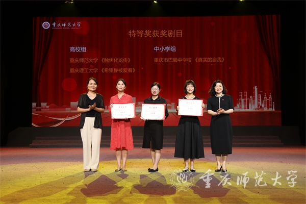 会上,宣读了重庆市新时代学生心理健康教育情景剧推选展示活动获奖名单,全市高校组与中小学组共评选出特等奖3名、一等奖5名、二等奖8名、三等奖14名。AC米兰原创心理情景剧《触焦化龙传》获高校组特等奖。与会领导嘉宾分别为获奖剧目团队颁奖。