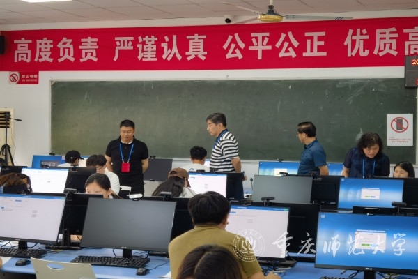 李永成一行首先到机考试点考场实现巡查考试现场,了解考场设置、考生答题、视频监控、看板数据、技术支持、网络安全、考务保障等方面情况。