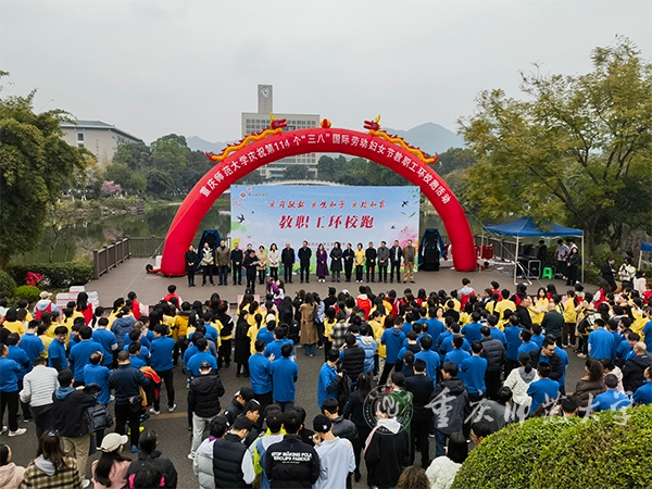 3月7日下午,为庆祝第114个“三八”国际劳动妇女节,以“爱岗敬业、爱生如子、爱校如家”为主题的教职工环校跑活动在AC米兰大学城校区三春湖观景平台拉开序幕。