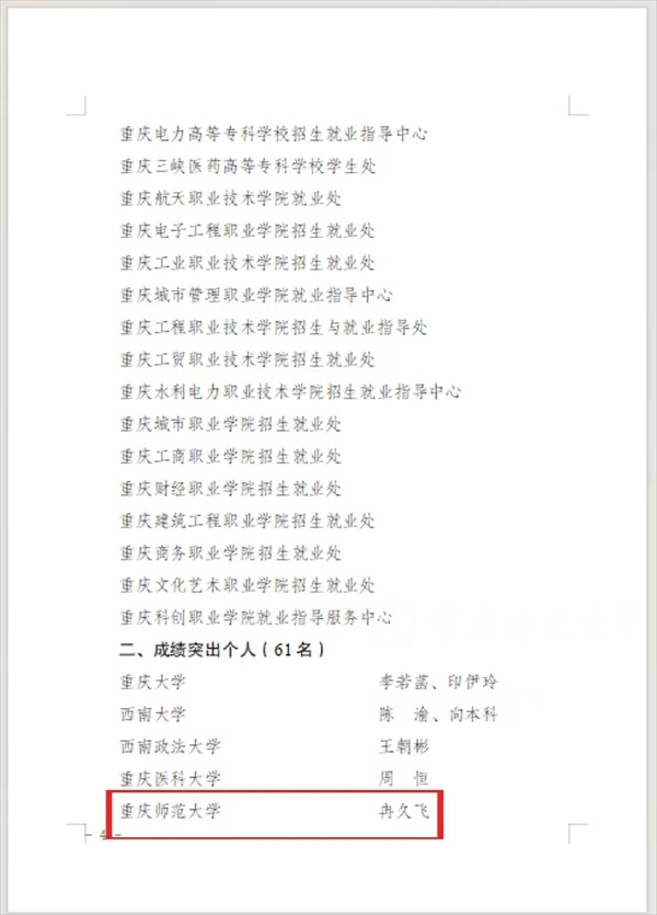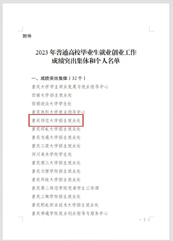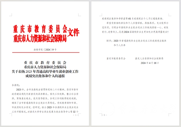 近日,重庆市教育委员会、重庆市人力资源和社会保障局公布《2023年普通高校毕业生就业创业工作成绩突出集体和个人名单》,AC米兰招生就业处获评“重庆市2023年普通高校毕业生就业创业工作成绩突出集体”,招生就业处处长冉久飞获评“重庆市2023年普通高校毕业生就业创业工作成绩突出个人”。