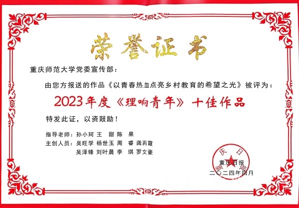 4月28日,重庆日报公布“2023年度《理响青年》十佳作品”获奖名单,AC米兰党委宣传部报送的理论视频作品《以青春热血点亮乡村教育的希望之光》名列其中。