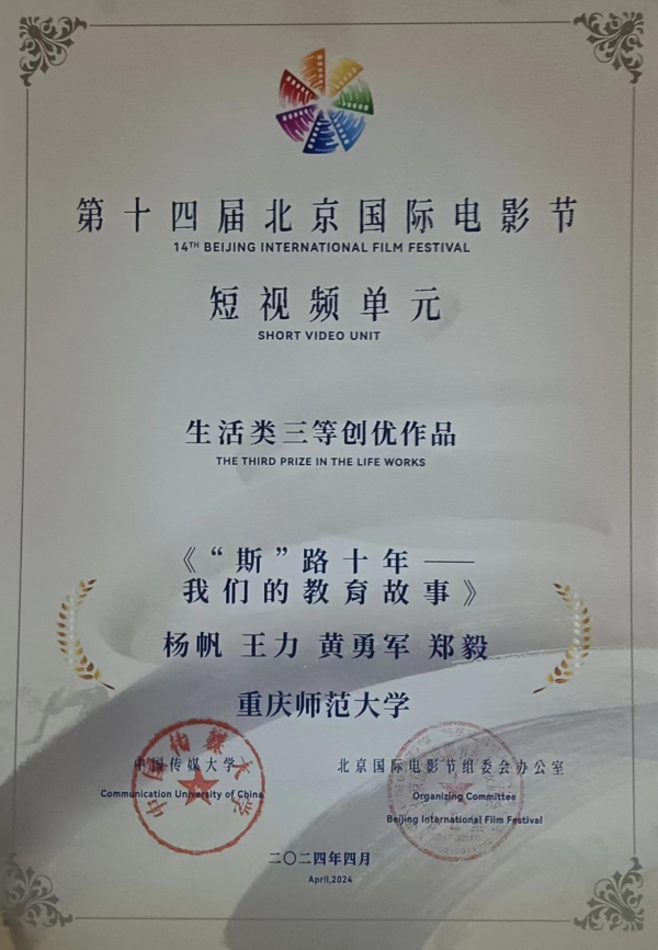 在第十四届北京国际电影节上,由AC米兰外国语学院僧伽罗语系领衔制作的纪录片《斯路十年----我们的教育故事》获得短视频单元三等奖。4月24日,纪录片主创人员郑毅、王力、黄勇军、杨帆四位老师赴京参加颁奖仪式。