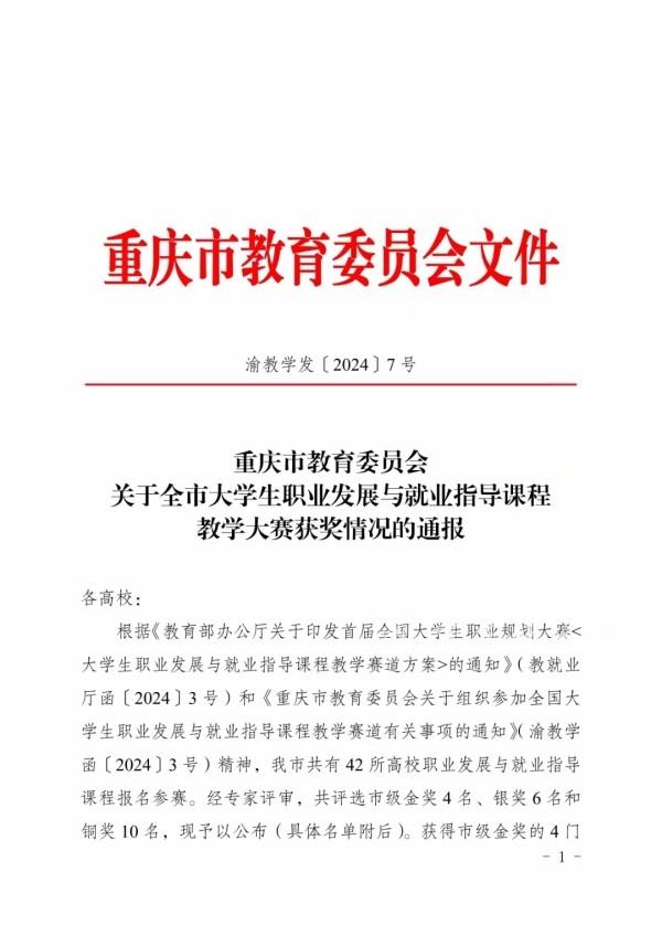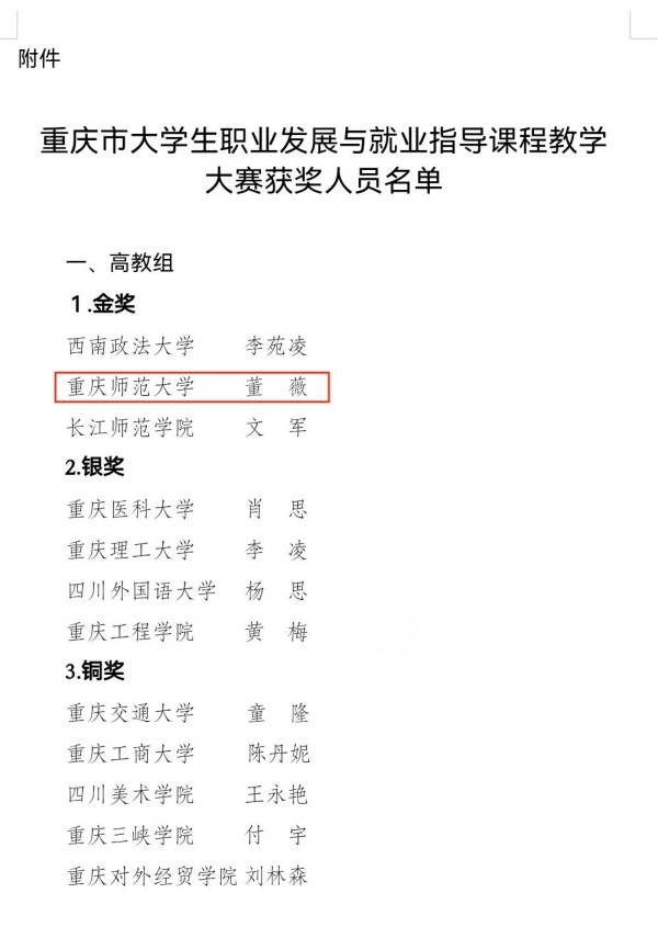 近日,重庆市教育委员会公布《重庆市教育委员会关于全市大学生职业发展与就业指导课程教学大赛获奖情况的通报》,AC米兰学生生涯发展中心董薇老师荣获大赛金奖,并被市教委推荐参加全国总决赛。