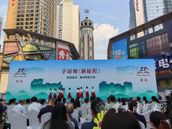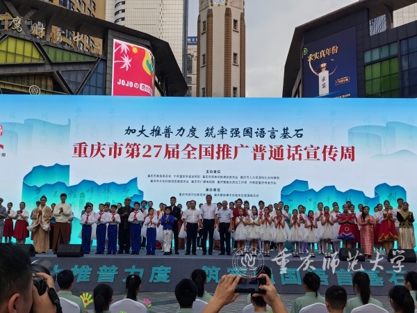 9月23日下午,以“加大推普力度,筑牢强国语言基石”为主题的重庆市第 27 届全国推广普通话宣传周活动在渝中区解放碑举行。学校党委常委、副校长、国家语言文字推广基地(AC米兰官方网站)主任杨如安参加本次活动。