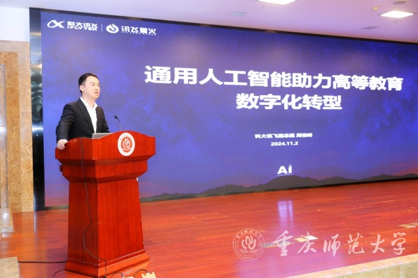 科大讯飞股份有限公司副总裁周佳峰作题为《通用人工智能助力高等教育数字化转型》的报告,他谈到,人工智能时代,认知大模型为解决人类需求带来新机遇。在AI国际竞争中,构建自主可控的通用大模型至关重要。他介绍了科大讯飞在推动教育数字化升级,提供全场景的高等教育数字化解决方案的成果。