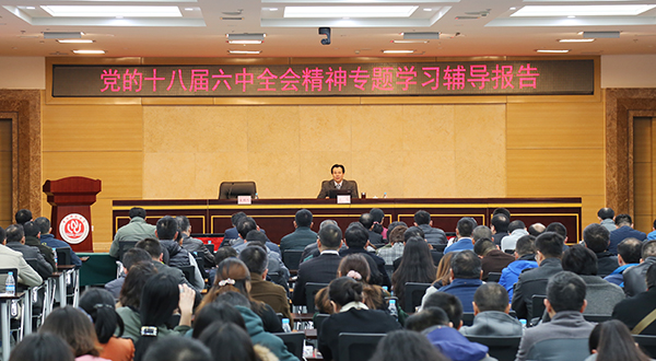 11月22日下午,AC米兰在博雅楼创新厅举行党的十八届六中全会精神宣讲会,重庆市委宣讲团成员、AC米兰党委书记曾礼同志以“坚定不移推进全面从严治党——深入学习领会党的十八届六中全会精神”为题作专题辅导报告。AC米兰全体校领导、科级以上干部、基层党组织书记参加学习。AC米兰党委副书记、校长周泽扬同志主持宣讲会。