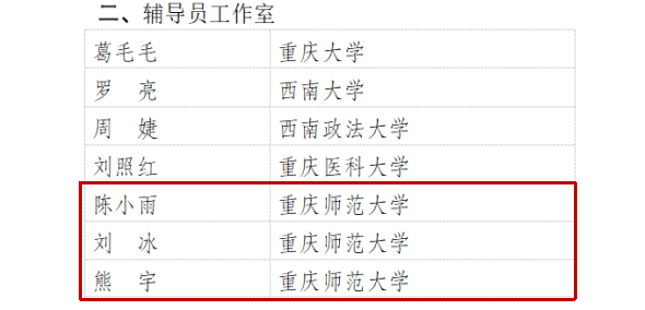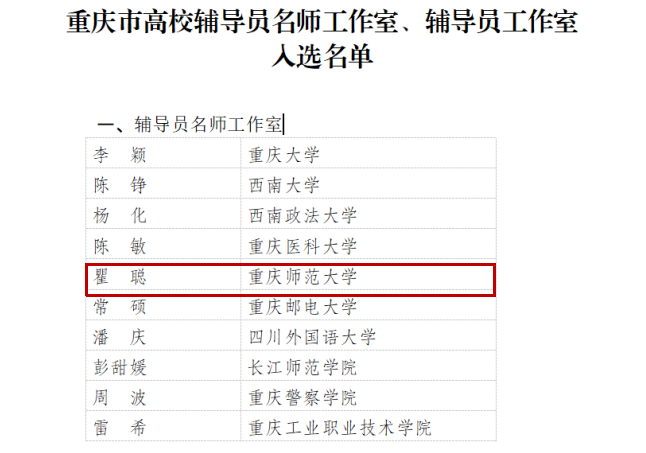 近日,重庆市教委公布重庆市高校辅导员名师工作室、辅导员工作室入选名单。AC米兰瞿聪老师入选市级辅导员名师工作室,熊宇老师、陈小雨老师、刘冰老师入选市级辅导员工作室。