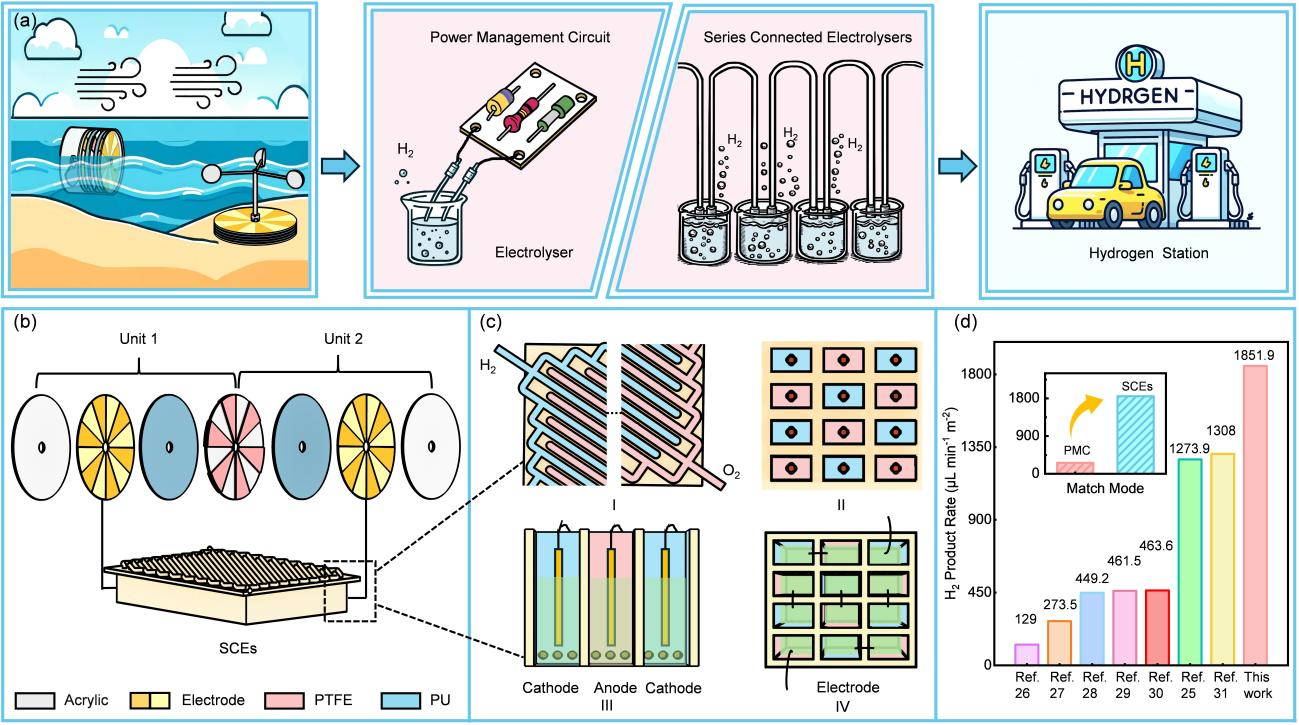 氢能是全球能源格局低碳转型的关键载体,其绿色制备技术备受关注。基于摩擦纳米发电机(TENGs)的环境机械能收集技术,为海水电解制氢提供了可持续解决方案,但TENGs与电解槽的阻抗失配问题严重制约能量利用效率。传统方案依赖电源管理电路(PMCs)进行阻抗调节,但会造成显著能量损耗并增加系统复杂度。对此,研究团队创新性开发出自供电的海水电解系统,实现了电荷迁移摩擦纳米发电机(CM-TENG)与串联电解池(SCEs)之间的直接阻抗匹配,将电能利用效率提升至98.9%,产氢速率达到1851.9 μL min⁻¹ m⁻²,优于以往研究。该系统与传统的TENG驱动电解系统不同,直接阻抗匹配策略显著降低了系统复杂性和额外能源消耗,提高了能量利用效率,为高效绿色制氢开辟新路径。