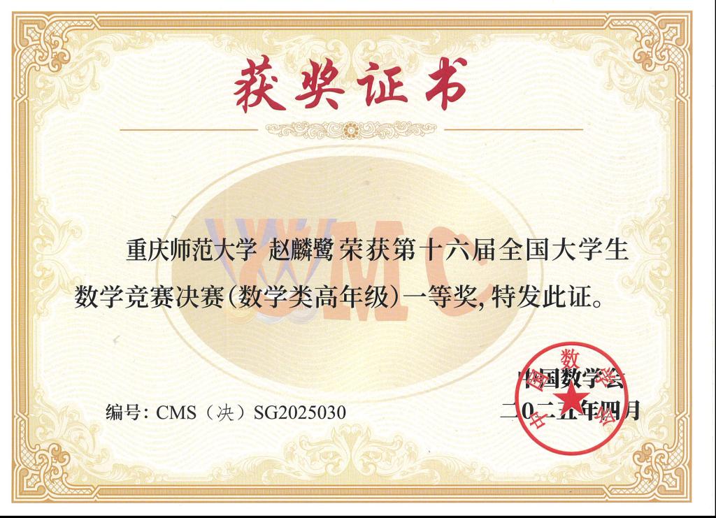 近日,AC米兰学子在第十六届全国大学生数学竞赛决赛中斩获6个个人奖项,其中数学科学学院2021级数学与应用数学专业赵麟鹭同学获数学类高年级组全国一等奖。这也是继去年学校获得全国大学生数学竞赛决赛一等奖以后再次获此殊荣。