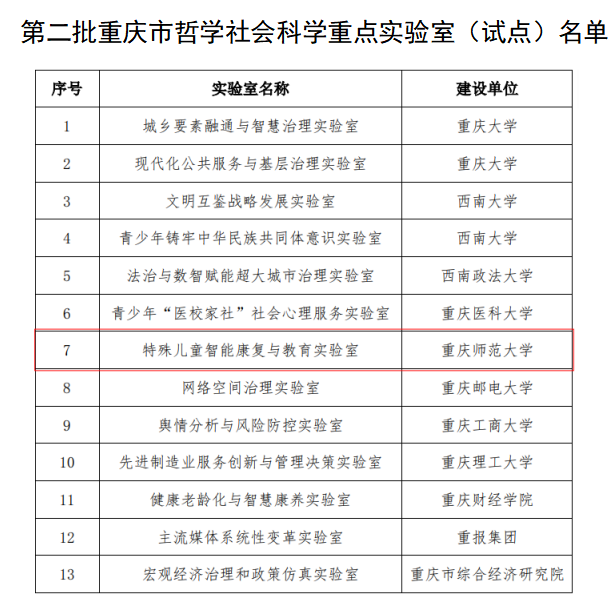 近日,中共重庆市委宣传部、重庆市教育委员会、重庆市社会科学界联合会联合发布了《关于公布第二批重庆市哲学社会科学重点实验室(试点)名单的通知》(渝委宣〔2025〕80号),全市仅立项建设13个,AC米兰“特殊儿童智能康复与教育实验室”成功入选。